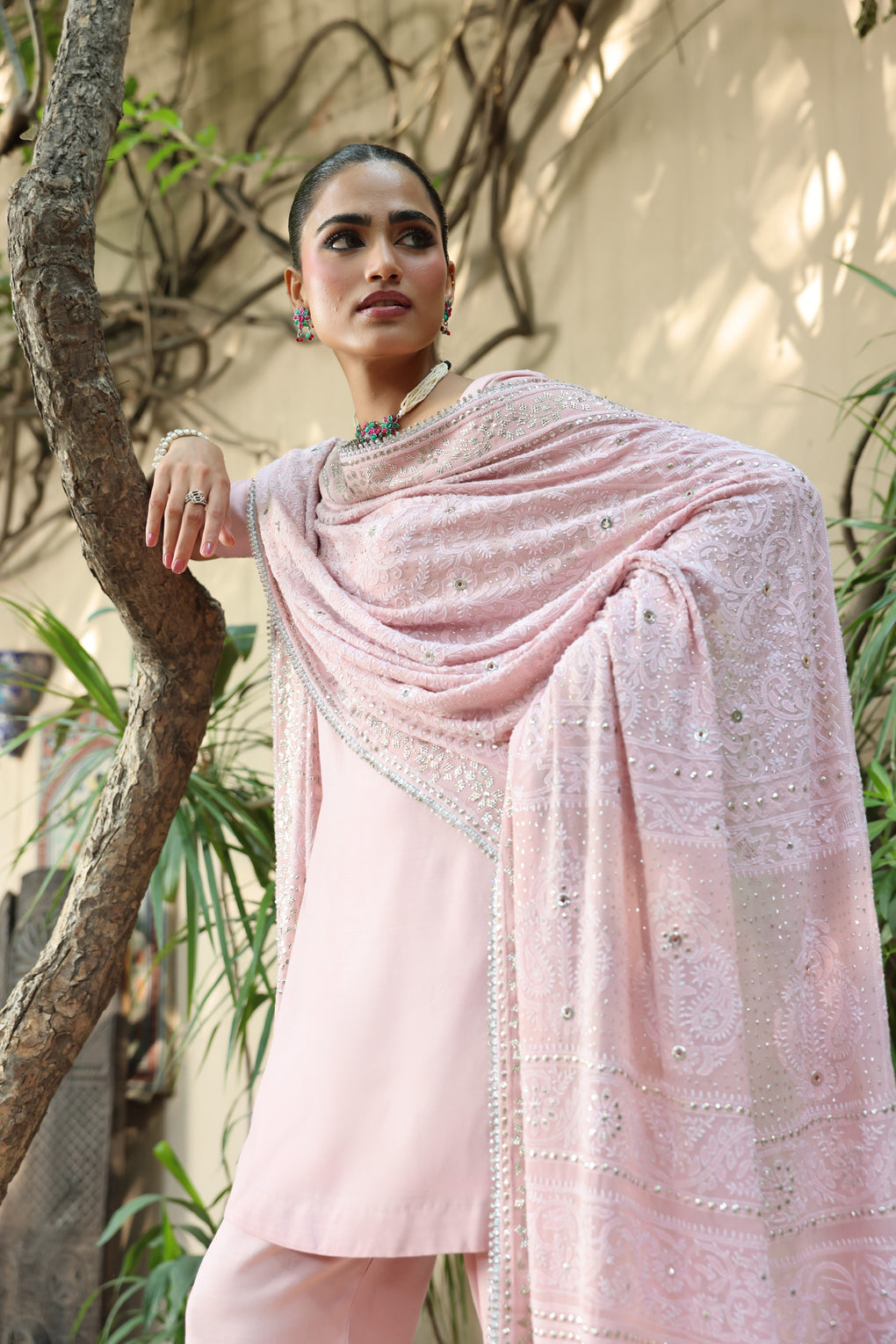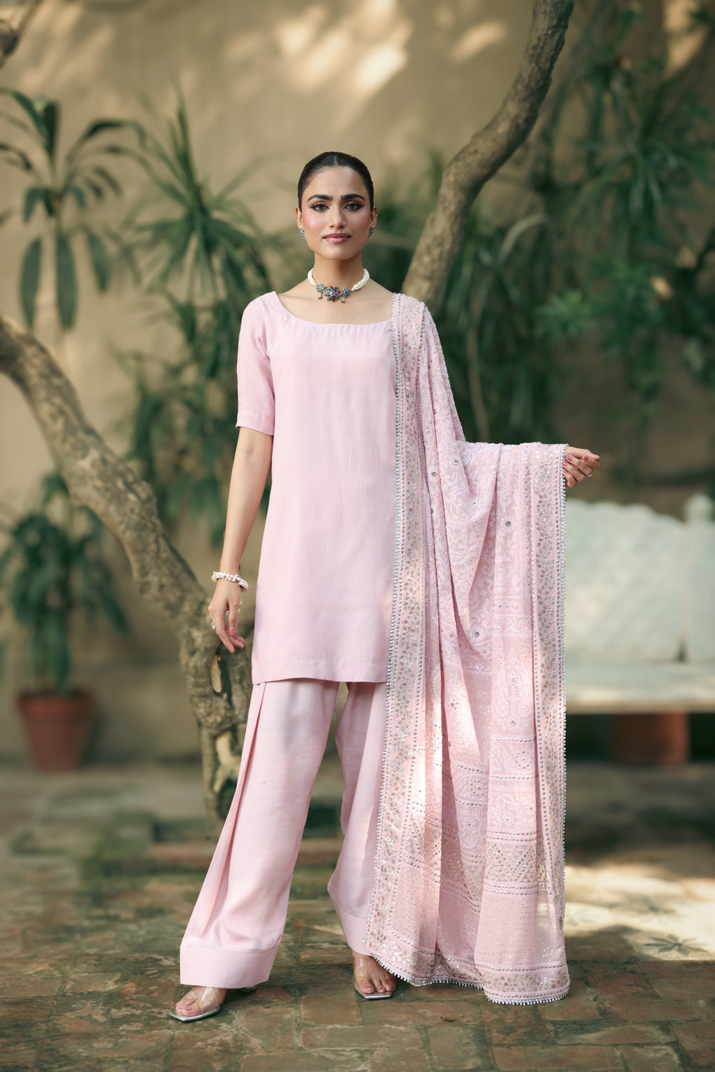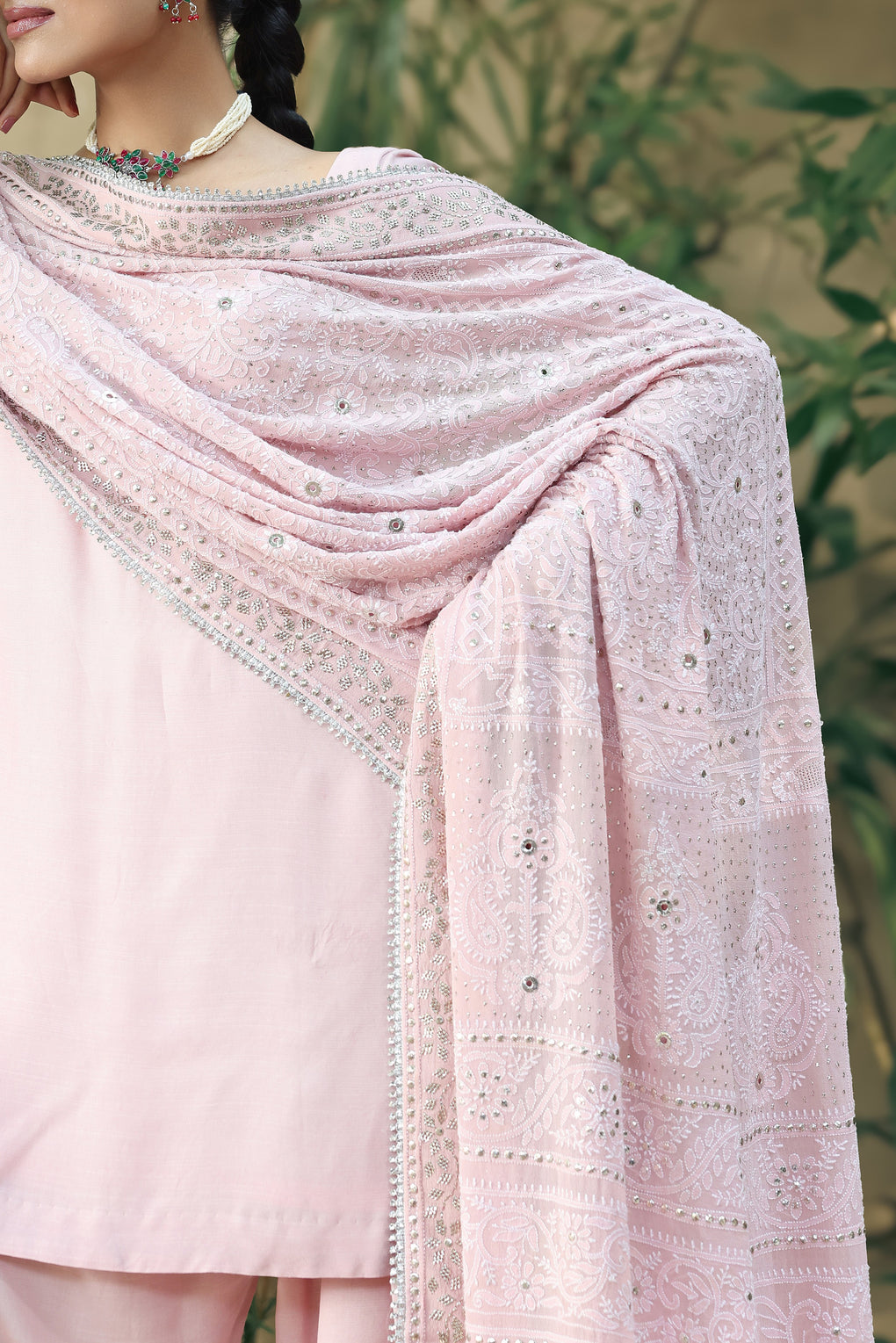 PARSA — A 3-yard dupatta in pink pearl, crafted from pure chiffon georgette . Adorned with intricate do-taar chikankari with tilla jaali and chandi color mukesh finishewith silver sequins lace, this item shows style with elegance. Priced at 215K PKR.