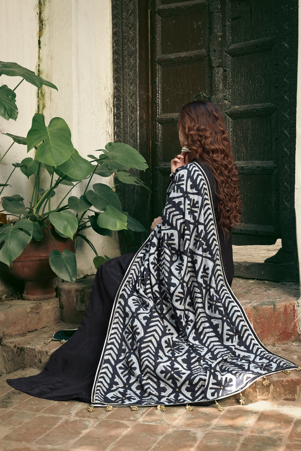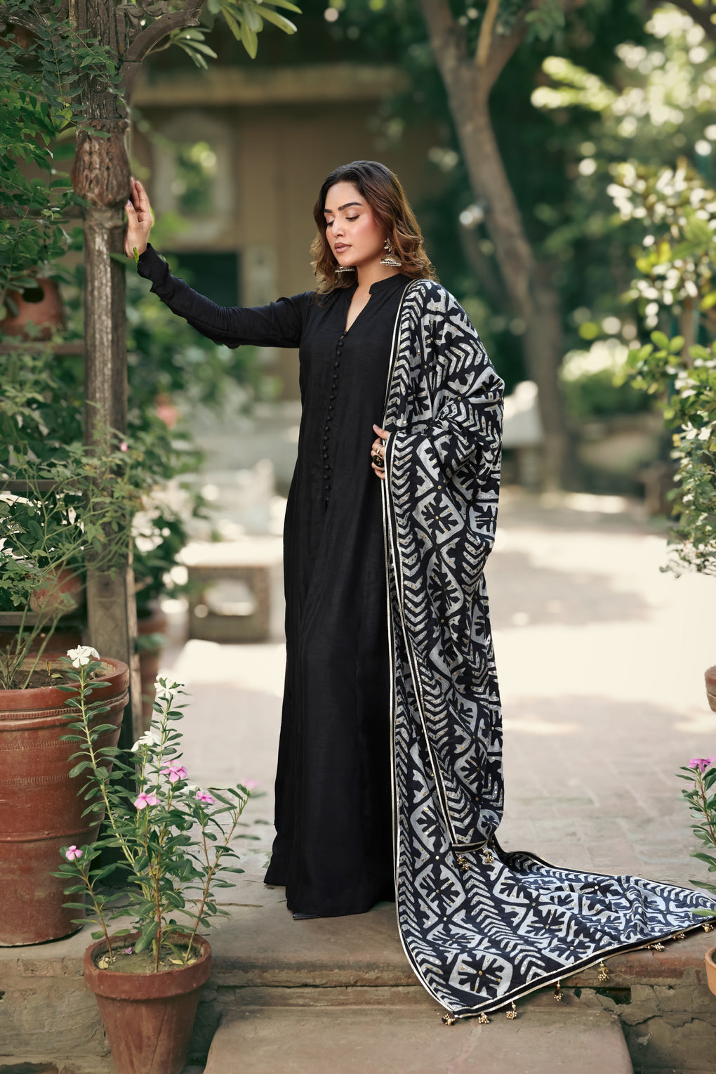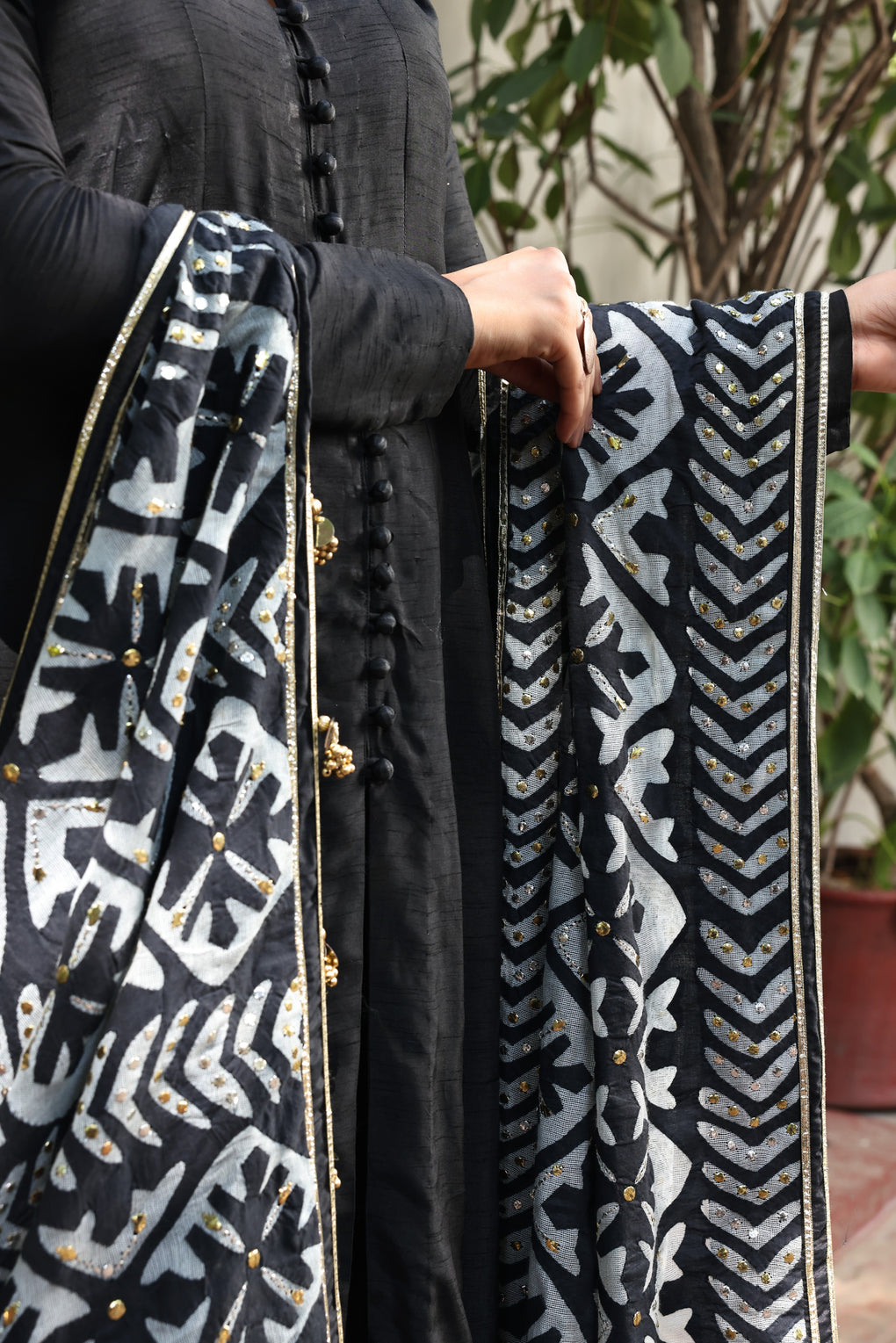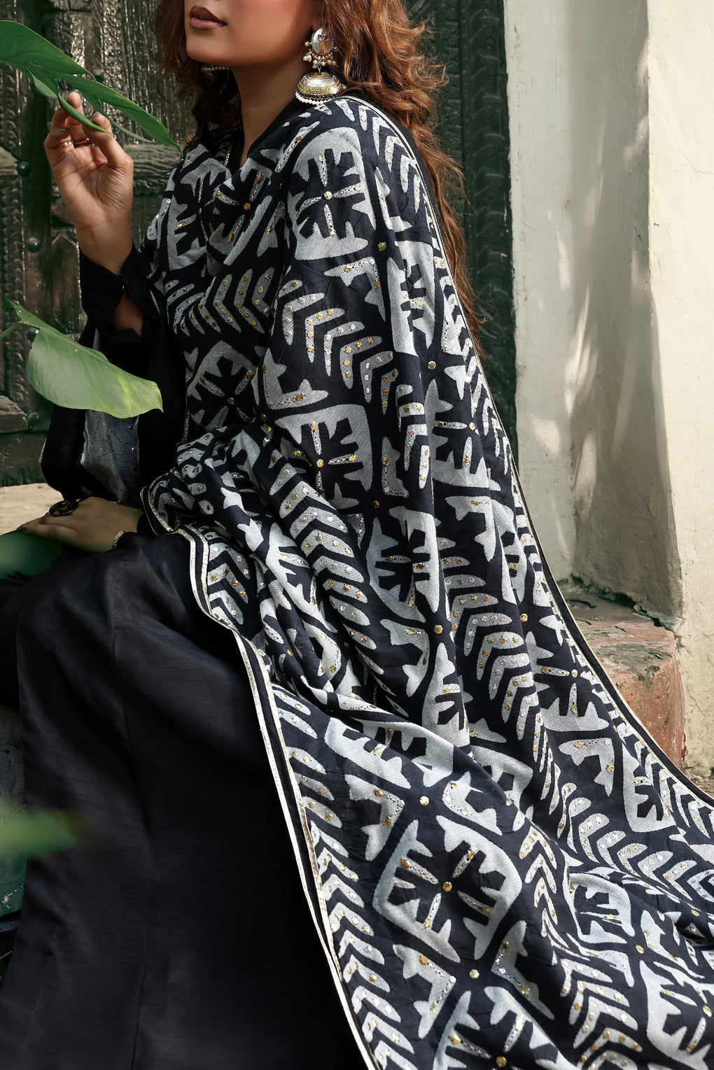 ROOHI — A 3-yard dupatta in black and grey, crafted frokhaadi cotton net . Adorned with ralli work embellished with golden mukesh finished with golden tassels , this creation mirrors grace. Priced at 110K PKR.