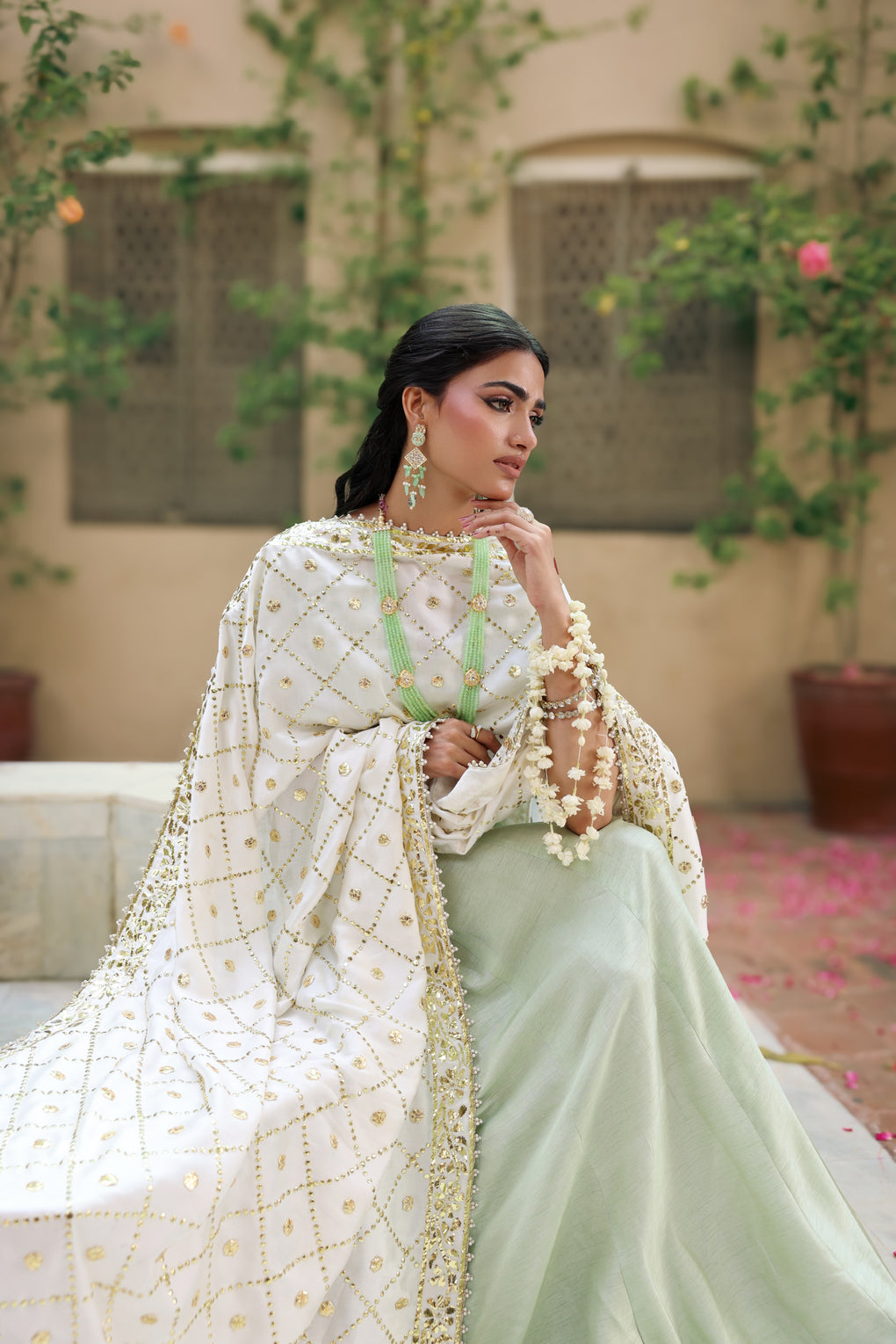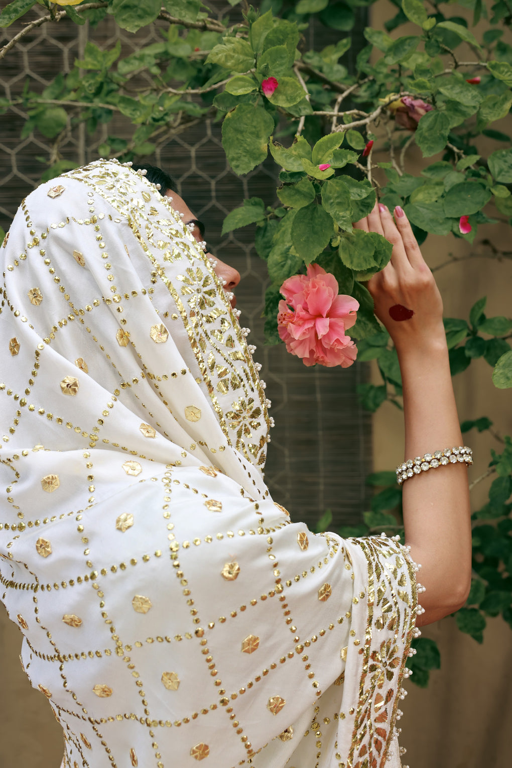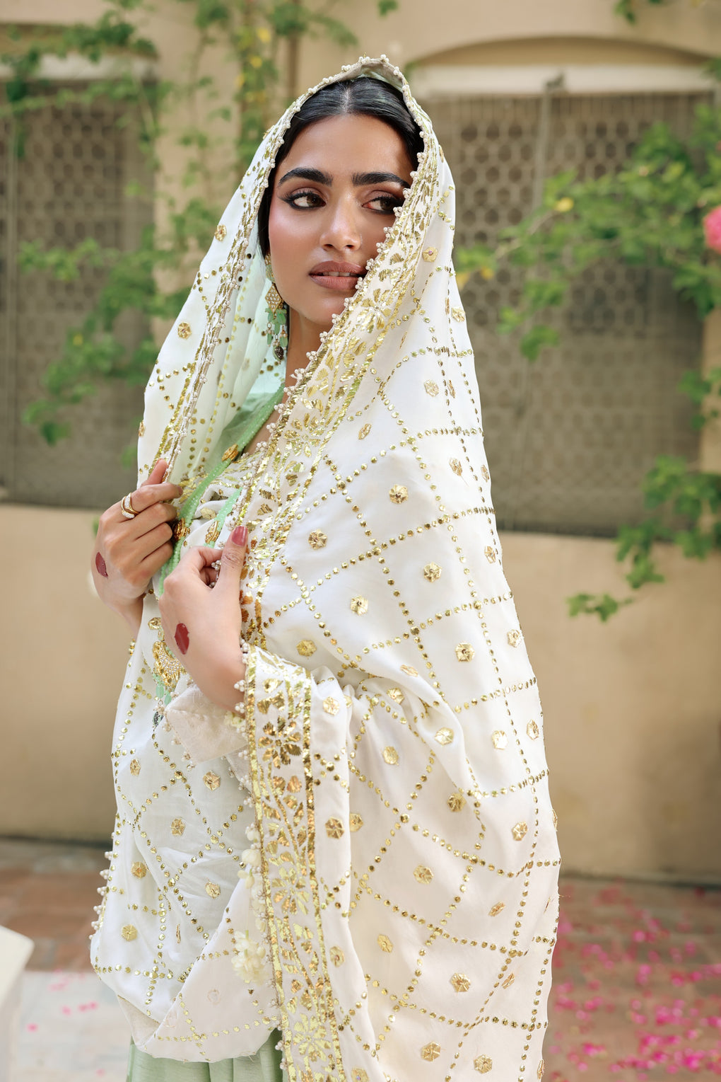 SHIREEN — A 3-yard dupatta in ivory white , crafted fromtissue silk . Adorned with golden mukesh embellished witakhrot gota, finished with pearl lace , this creation indicate smoothnes elegance. Priced at 85K PKR.