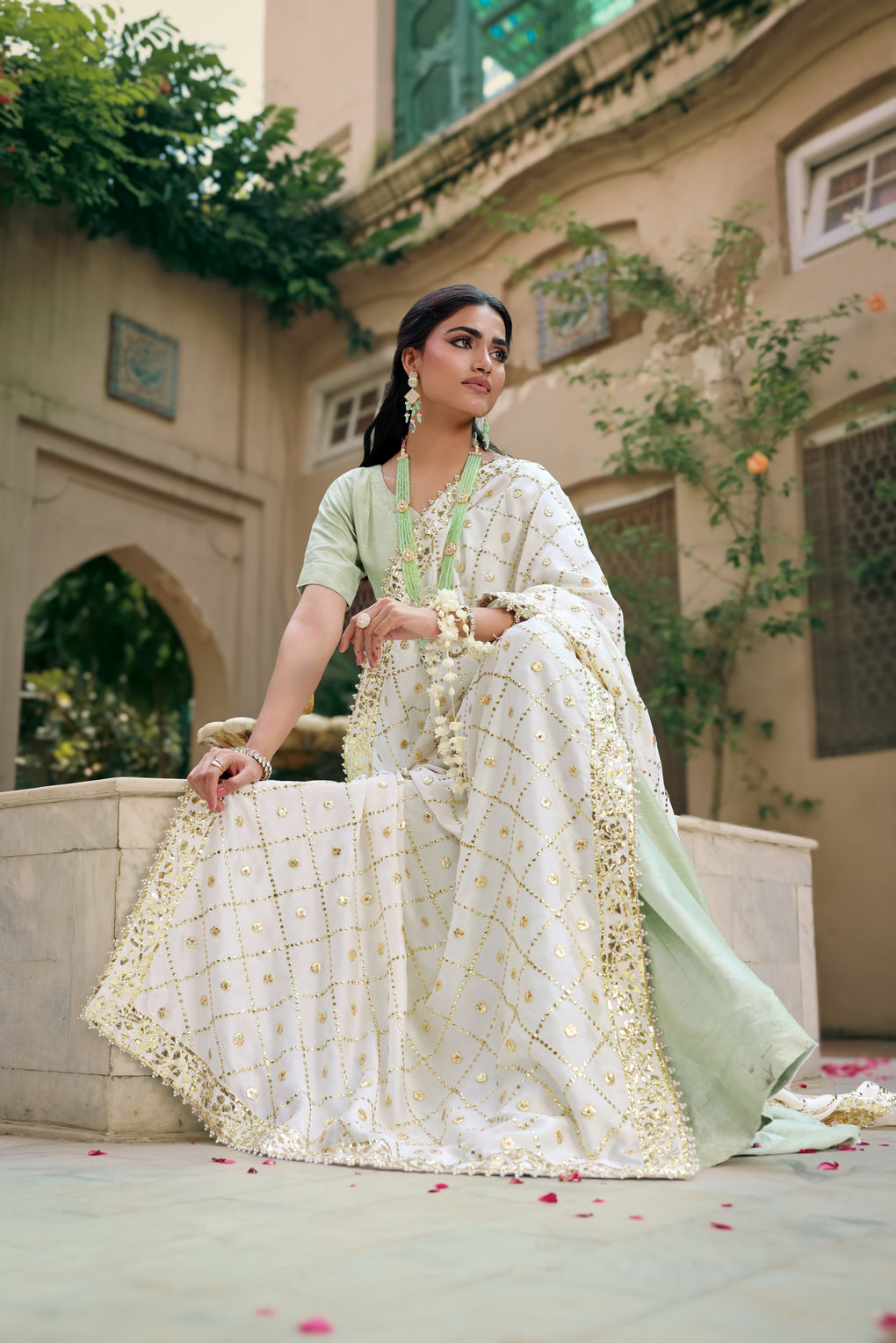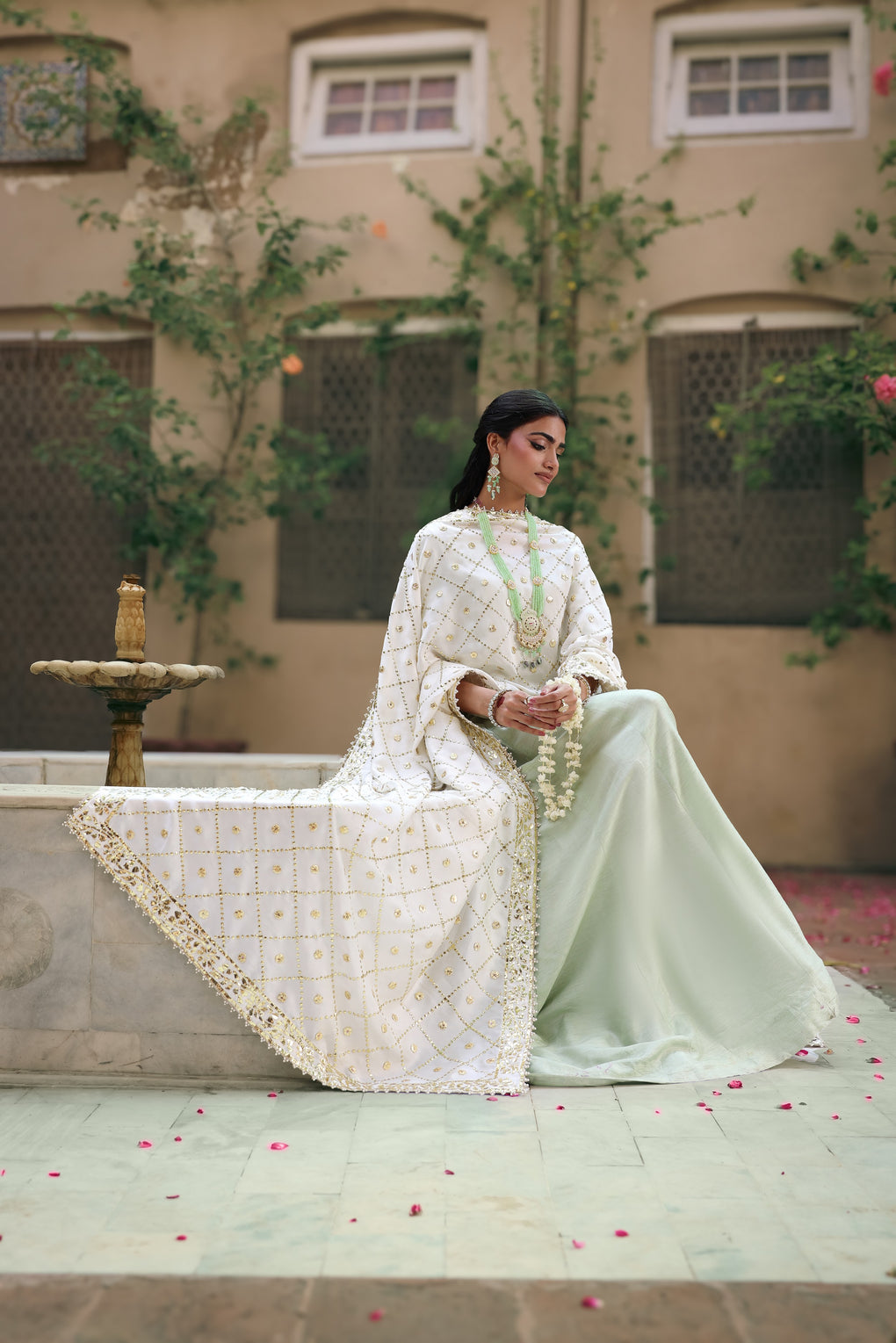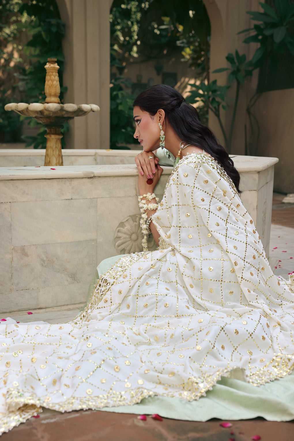 SHIREEN — A 3-yard dupatta in ivory white , crafted fromtissue silk . Adorned with golden mukesh embellished witakhrot gota, finished with pearl lace , this creation indicate smoothnes elegance. Priced at 85K PKR.