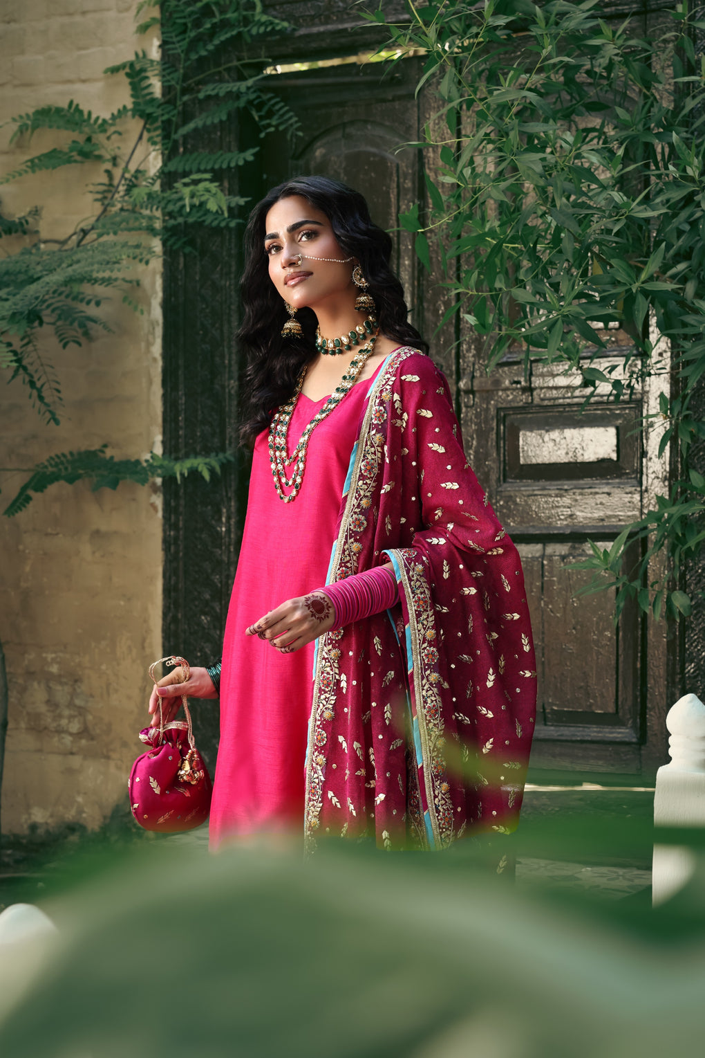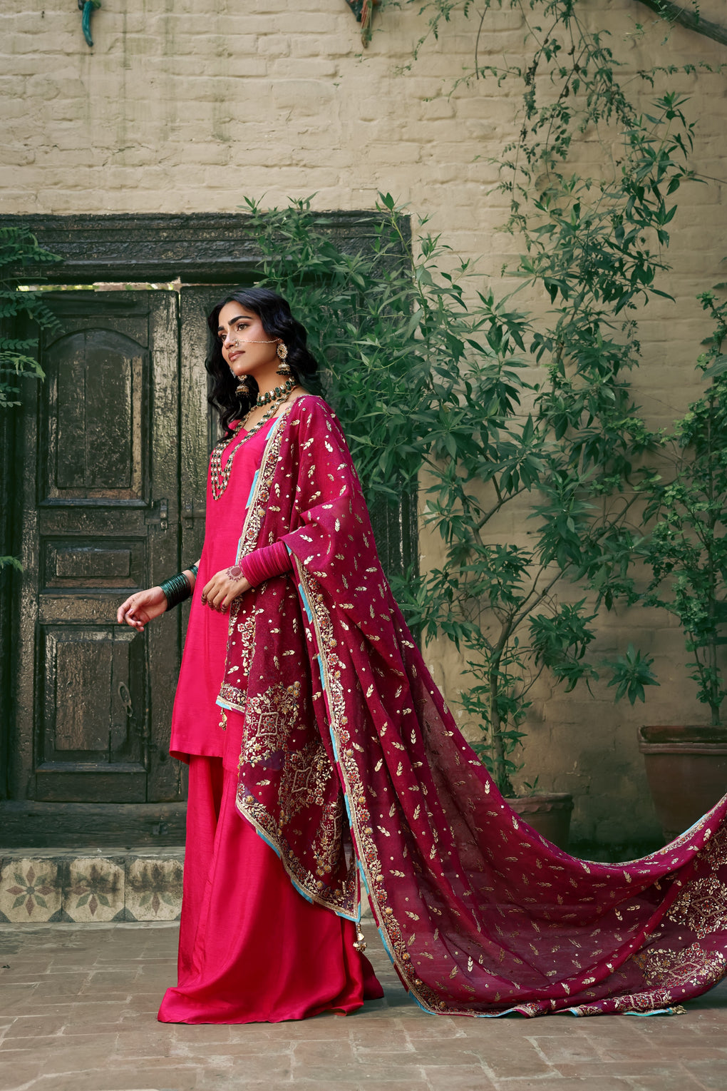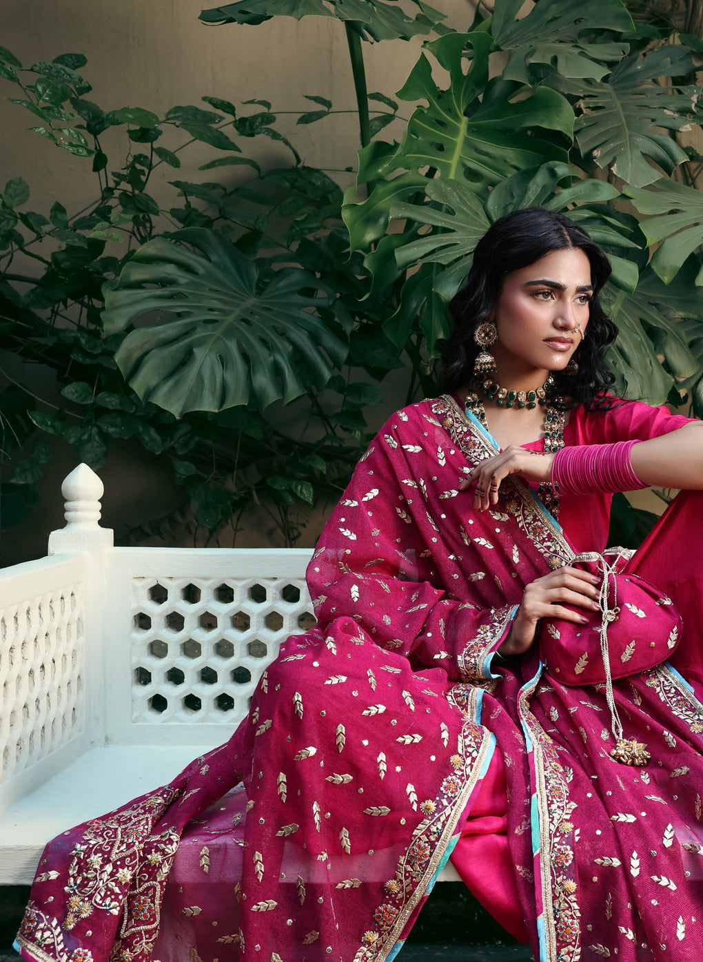 GULZAR — A 3-yard dupatta in bright fuschia , crafted from khaadi cotton net . Adorned with hand knotted vintage gota with sequins and intricate resham work knot finished with chata patti with a potli , this articale shows ageless style. Priced at 145K PKR.