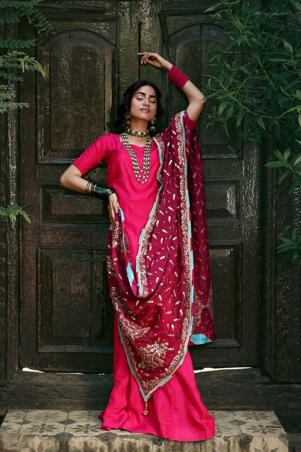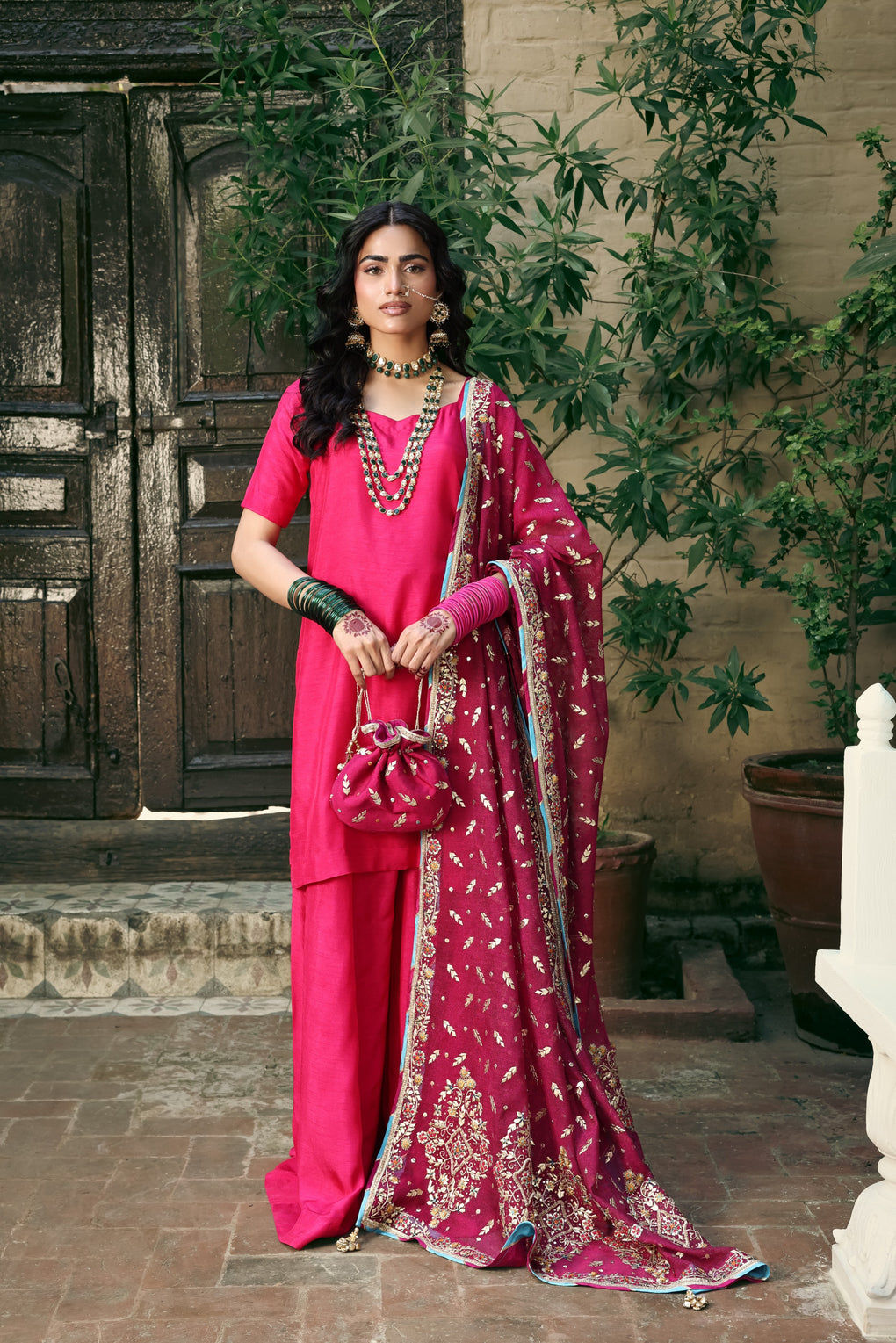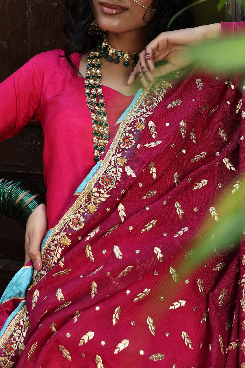 GULZAR — A 3-yard dupatta in bright fuschia , crafted from khaadi cotton net . Adorned with hand knotted vintage gota with sequins and intricate resham work knot finished with chata patti with a potli , this articale shows ageless style. Priced at 145K PKR.