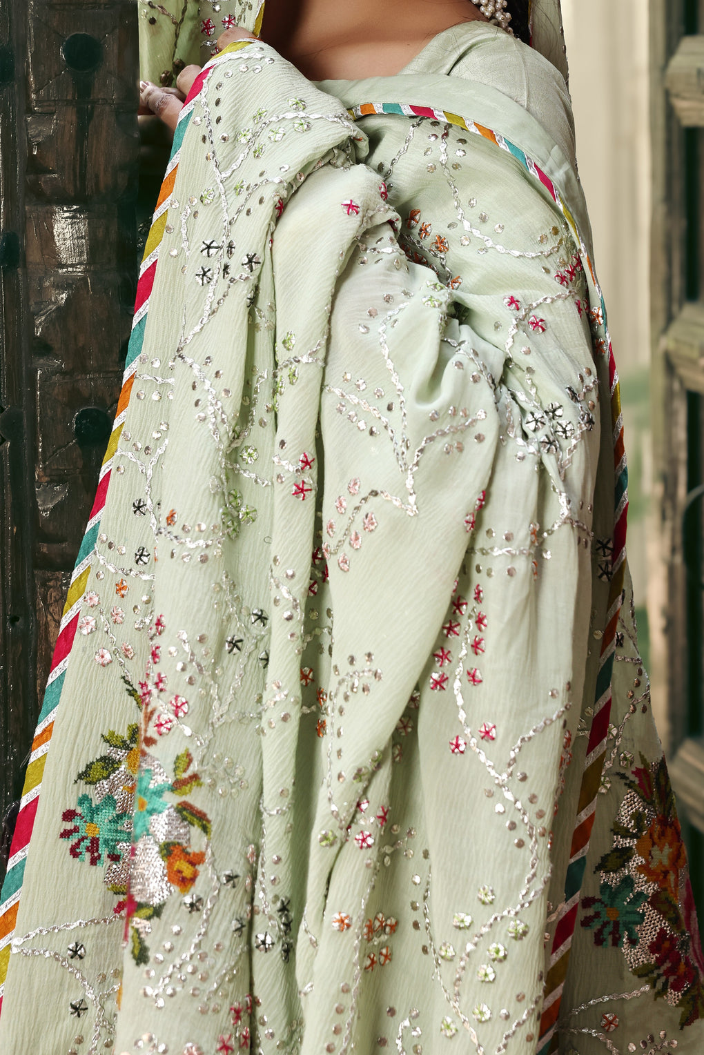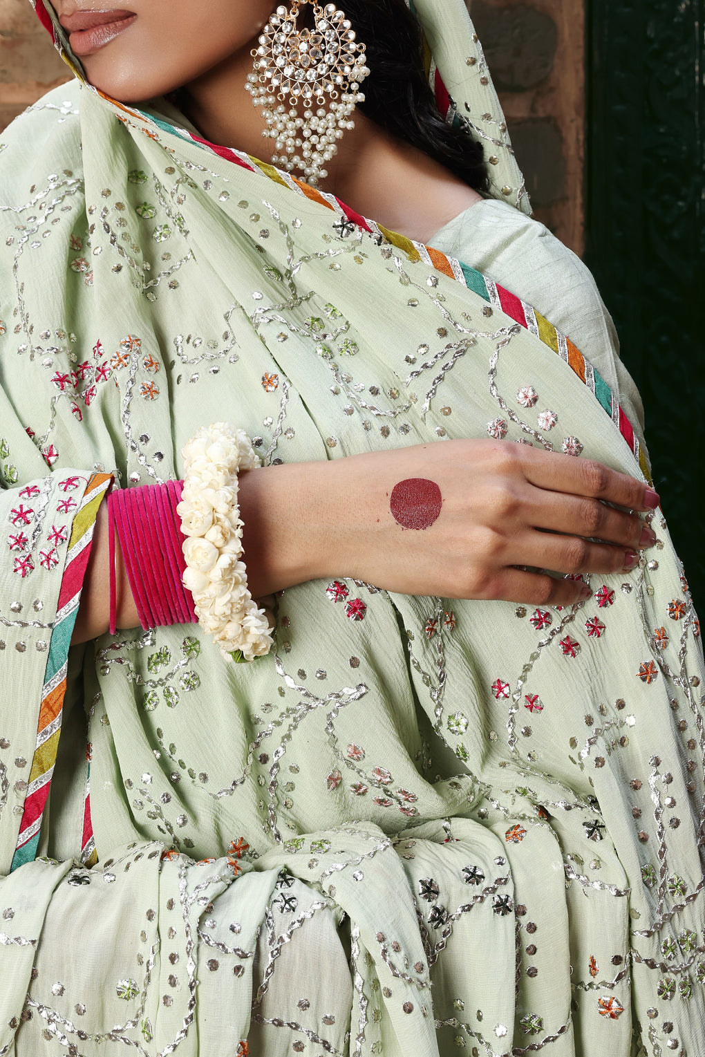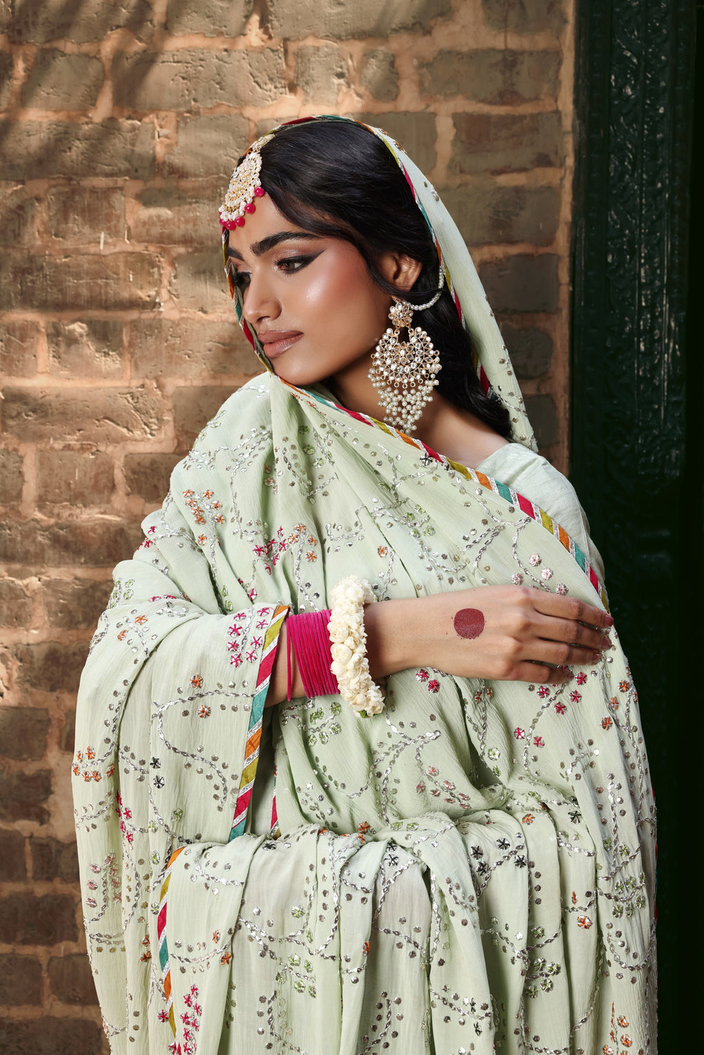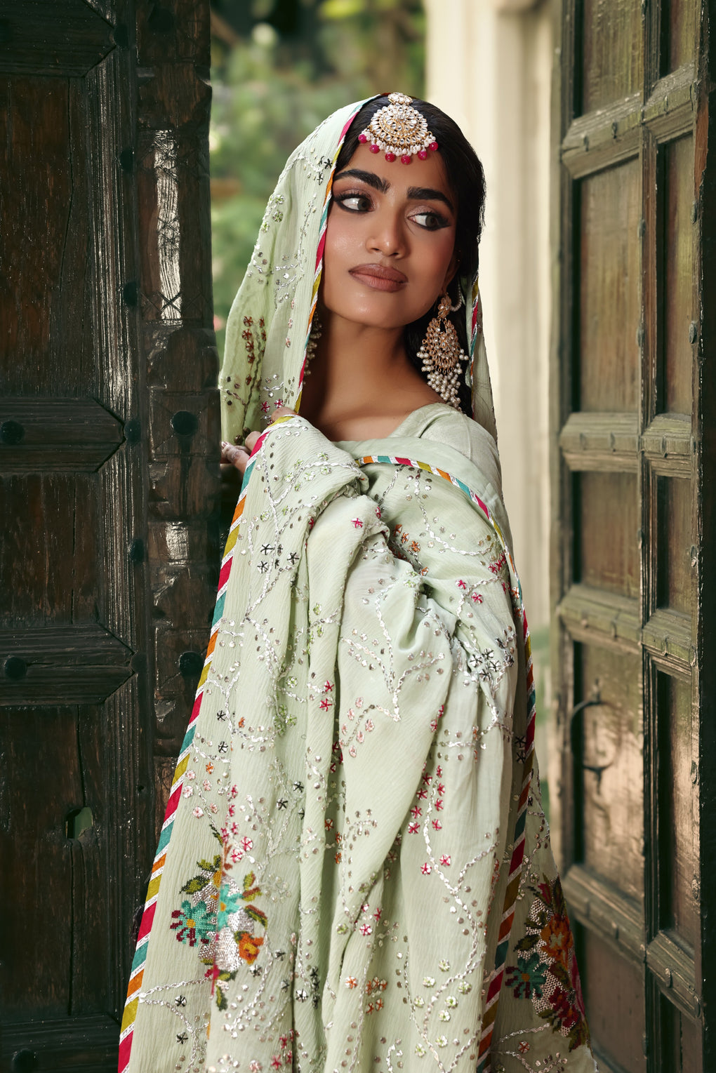 JAHAN ARA — A 3-yard dupatta in tea green , crafted from crinckle silk . Adorned with chandi patti mukesh, button mukesh, cross stitch, zero size gota with delicate resham work finished with chatta patti and comes with a traditional style potli, this Dupatta shows ageless style.Priced at 185K PKR.