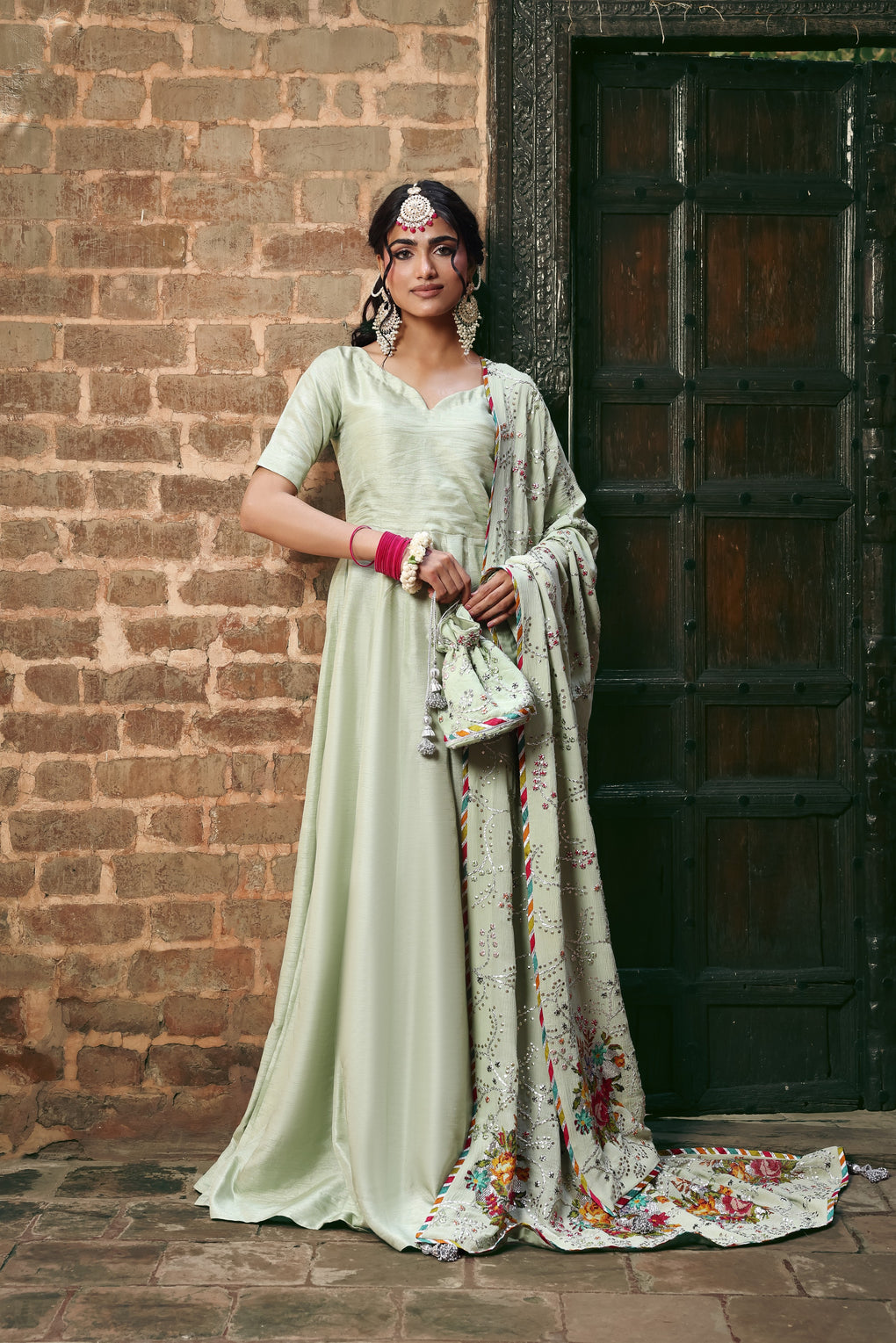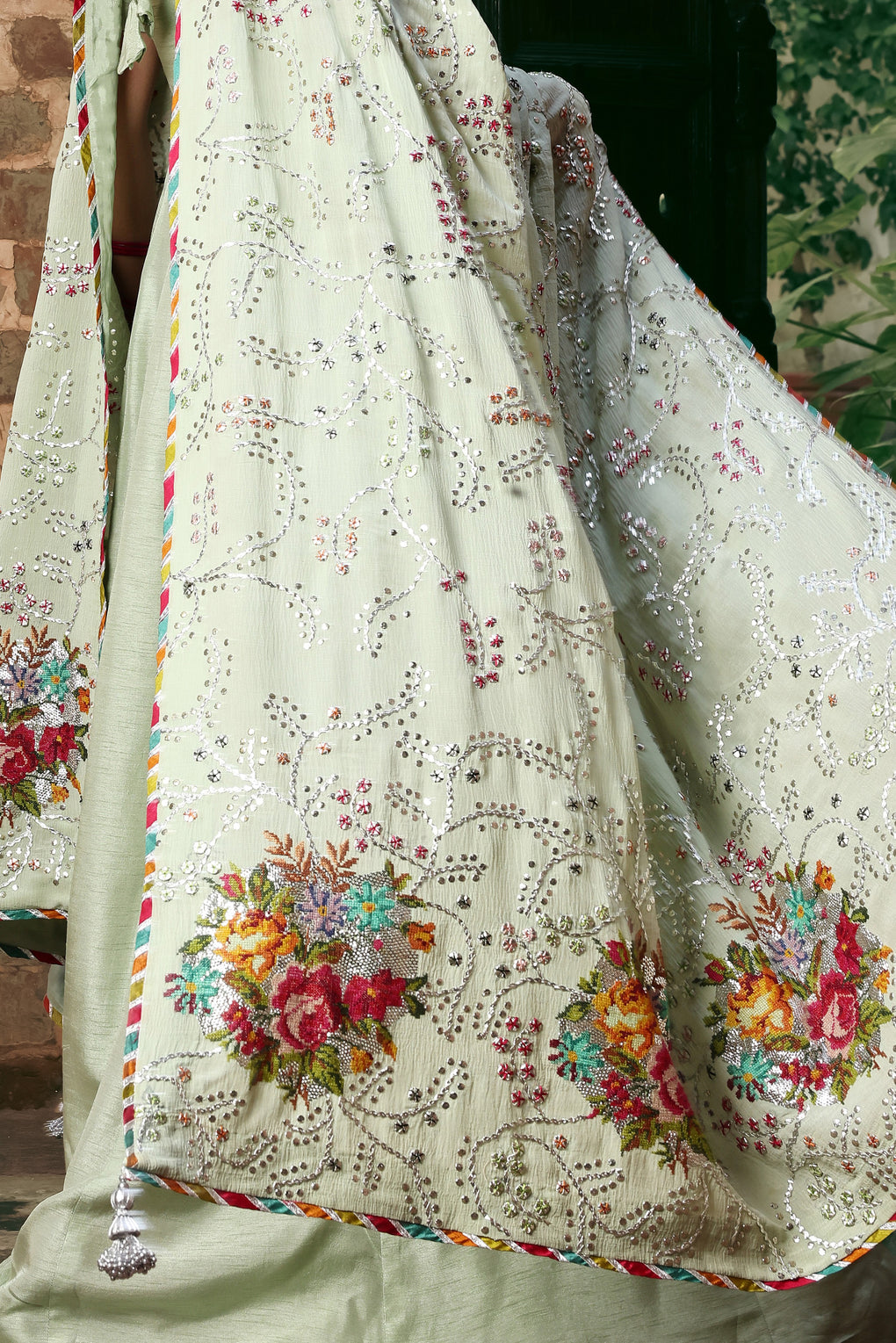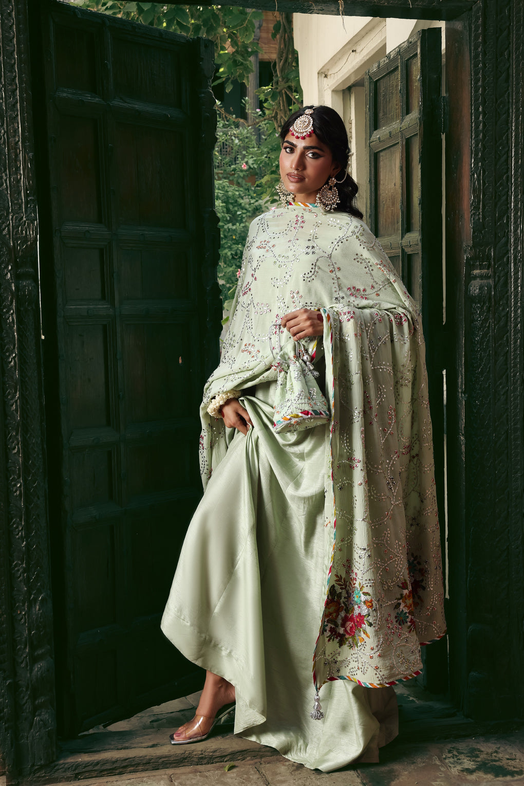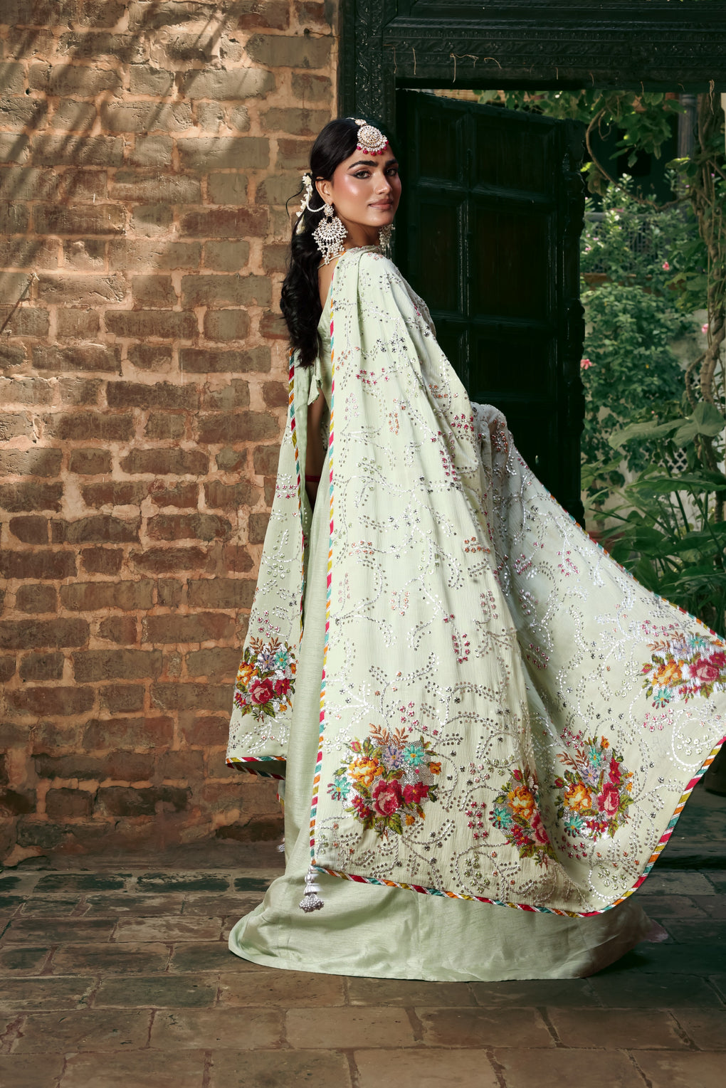 JAHAN ARA — A 3-yard dupatta in tea green , crafted from crinckle silk . Adorned with chandi patti mukesh, button mukesh, cross stitch, zero size gota with delicate resham work finished with chatta patti and comes with a traditional style potli, this Dupatta shows ageless style.Priced at 185K PKR.