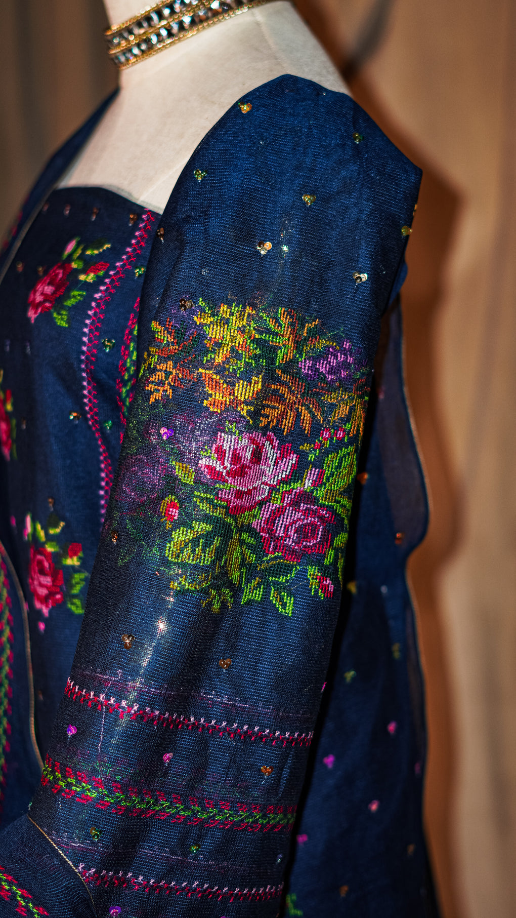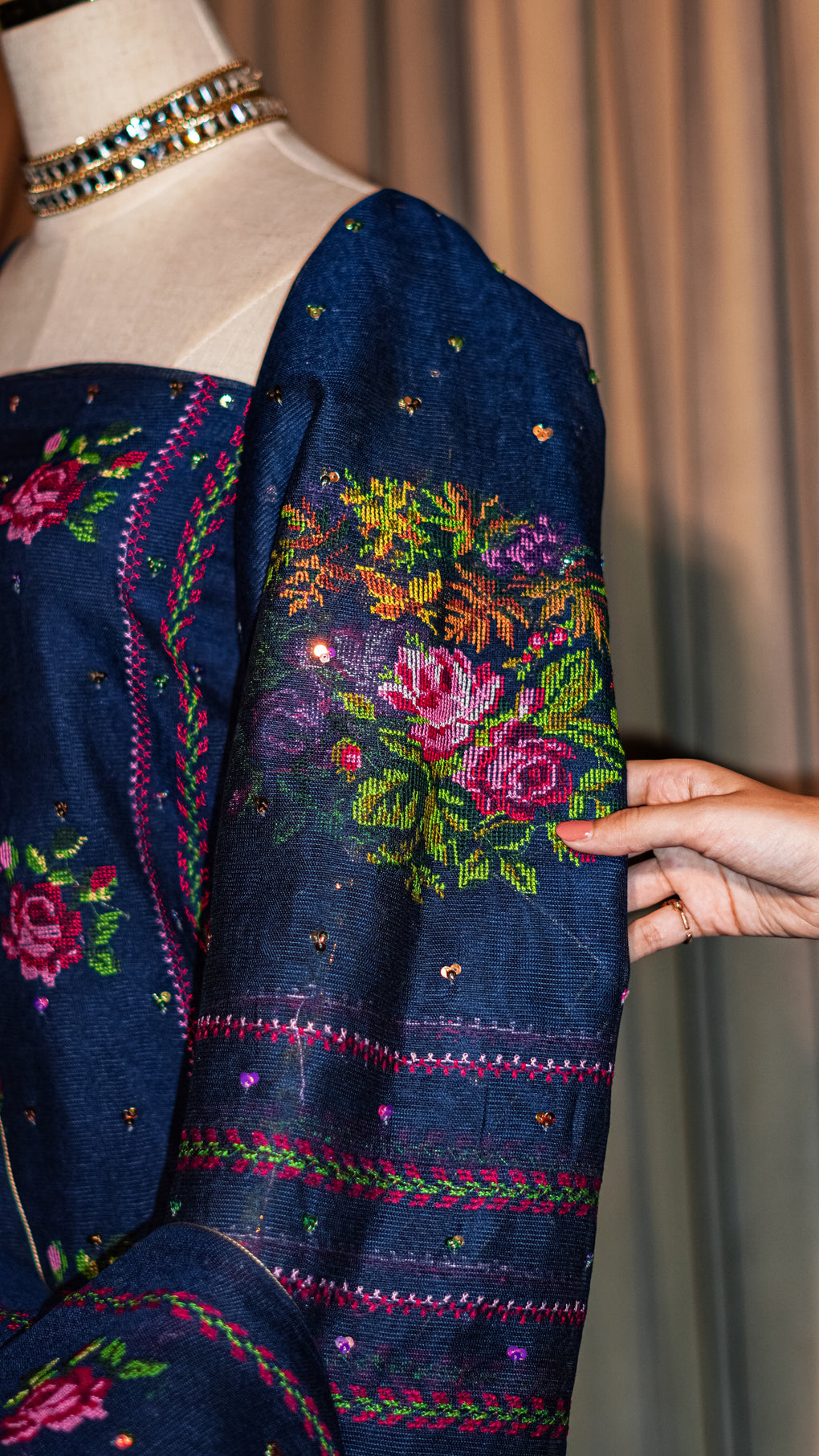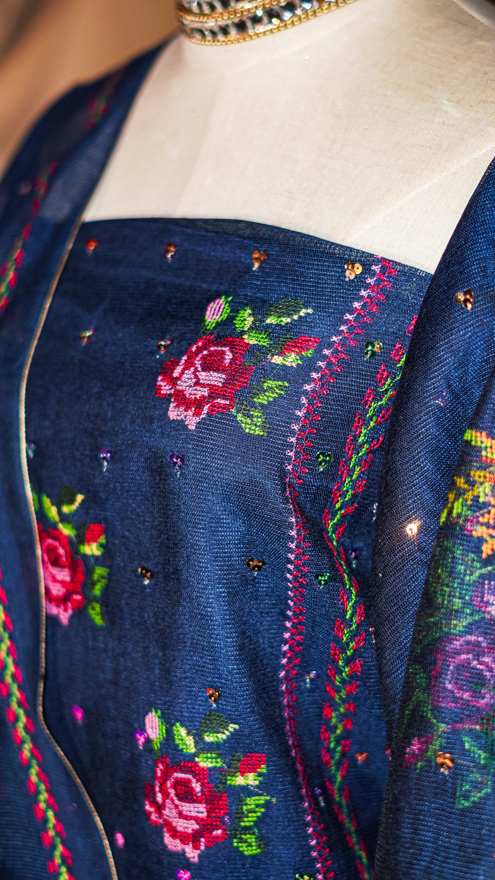 cross stitch embroidery embellished with sitara.