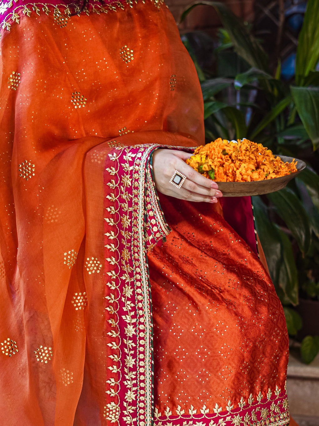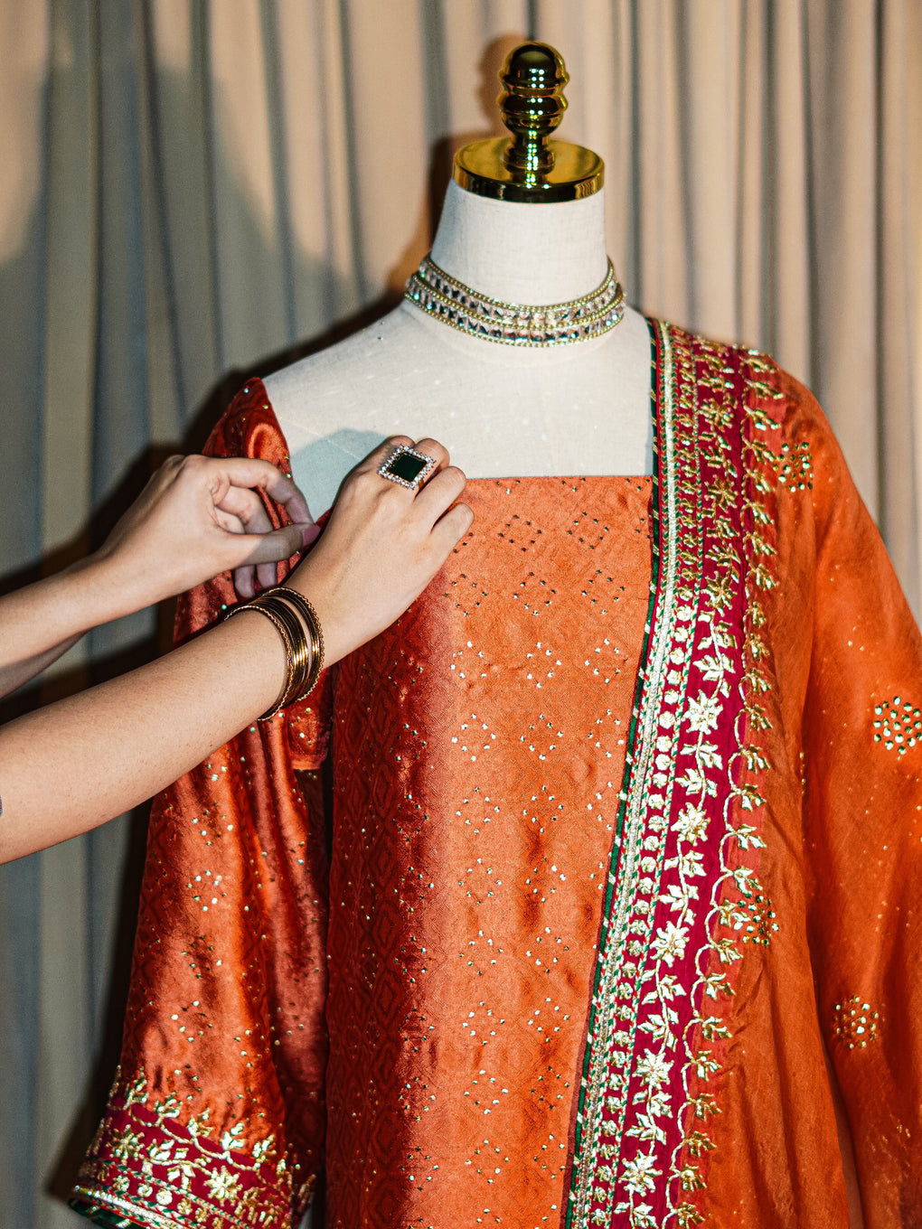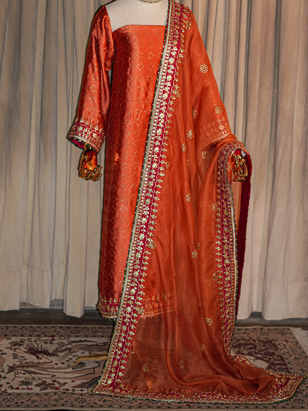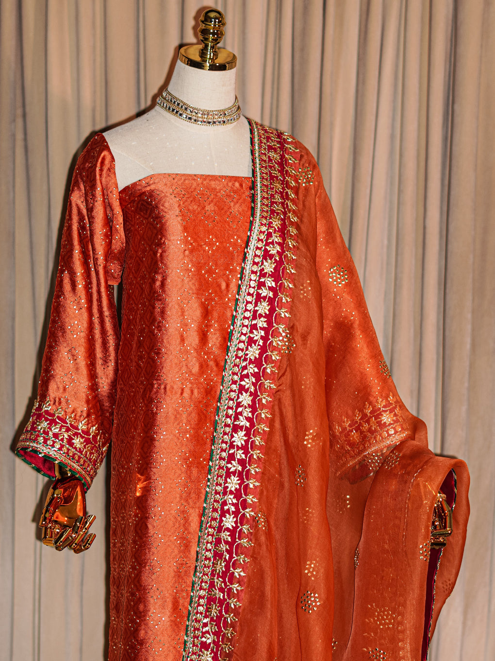 An Exquisite Ensemble Featuring A Katan Organza Dupatta Adorned With Gota And Mukesh Work. The Self Tissue Silk Shirt Pairs Beautifully With A Matching Silk Tissue Trouser. Hand Twisted Detailing Adds A Touch Of Traditional Finesse. Designed In A Zero Size Tailored Fit, Perfect For Festive And Formal Occasions.