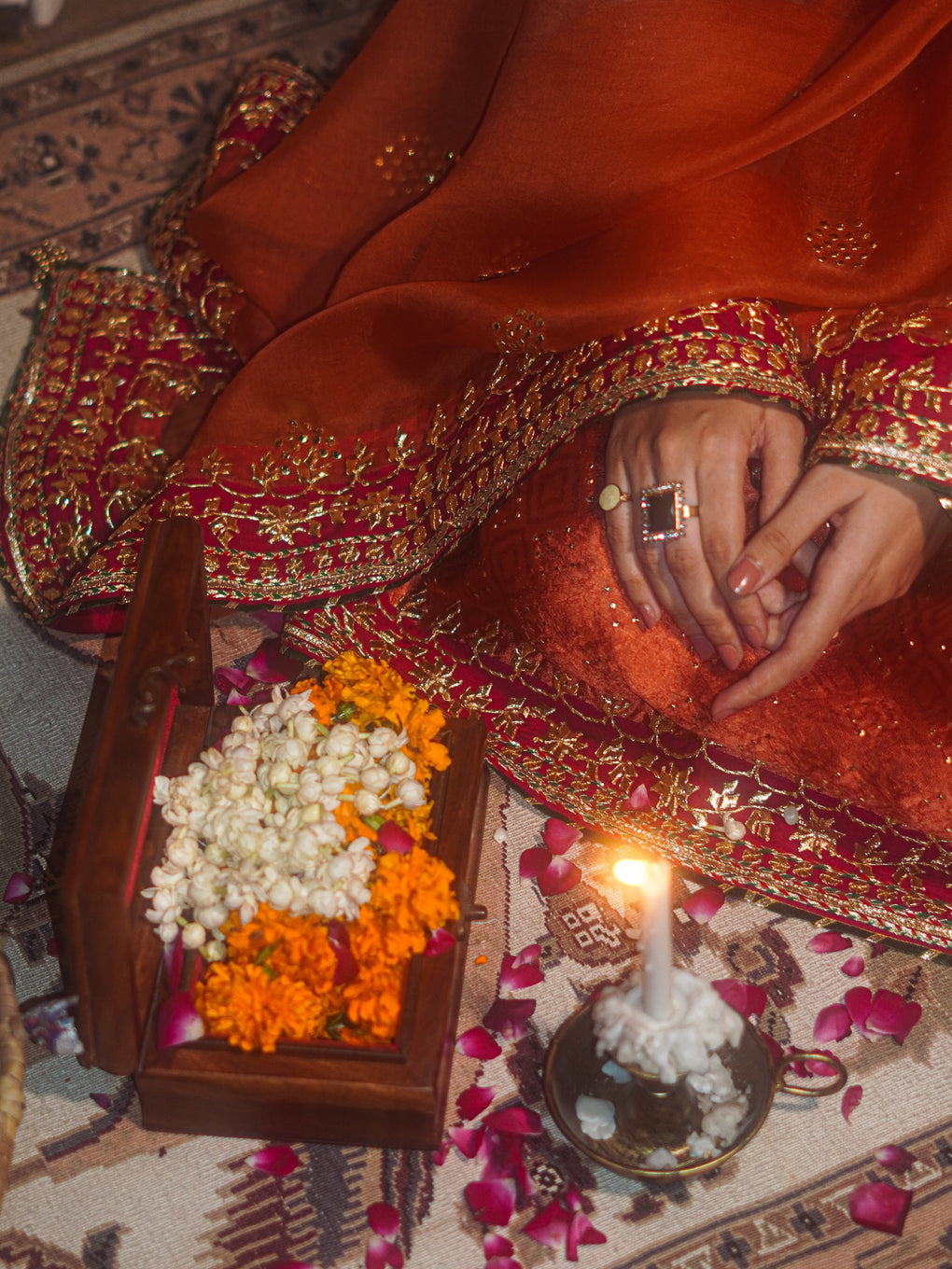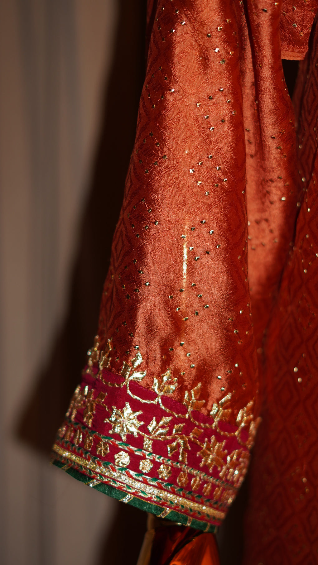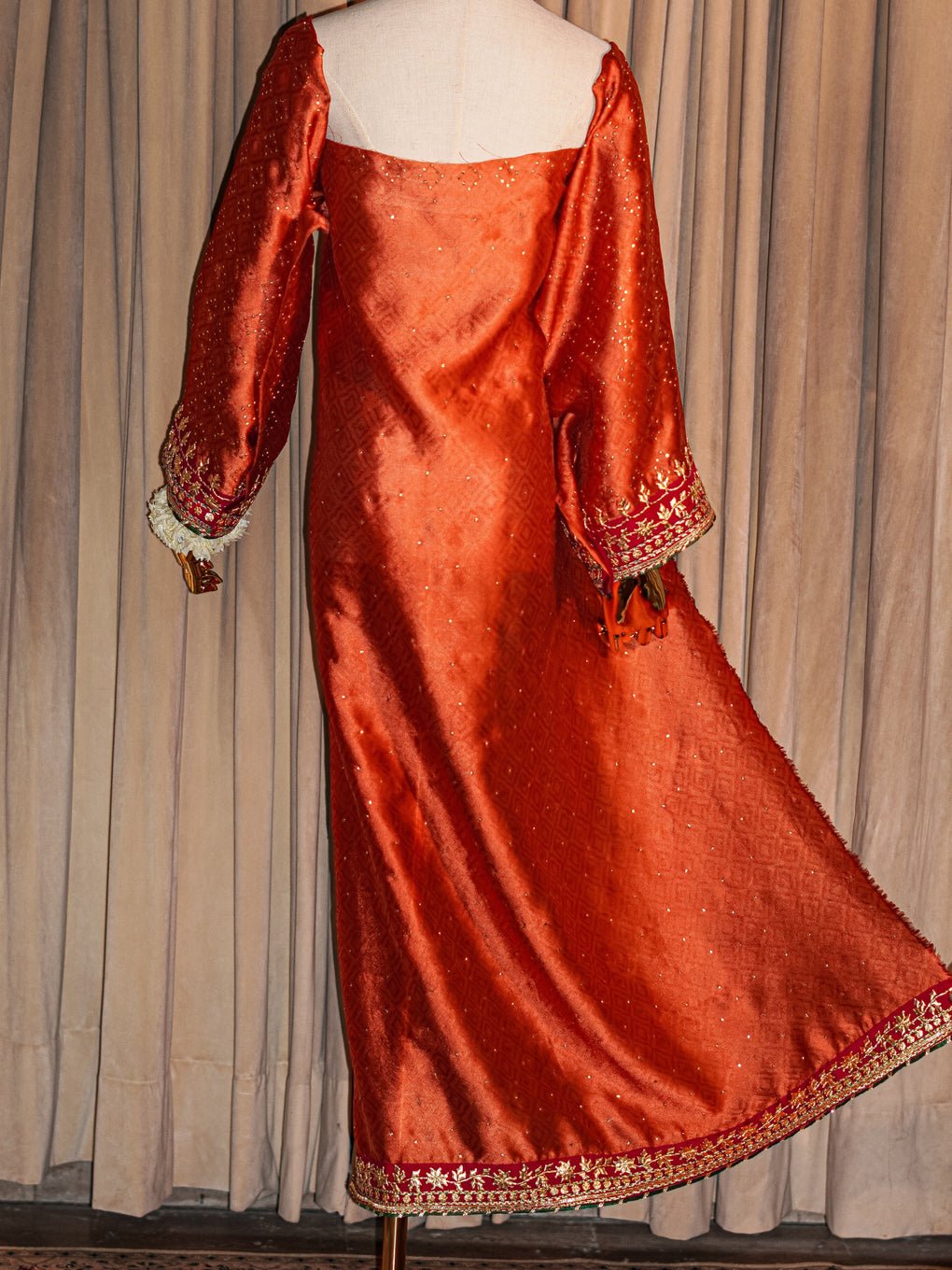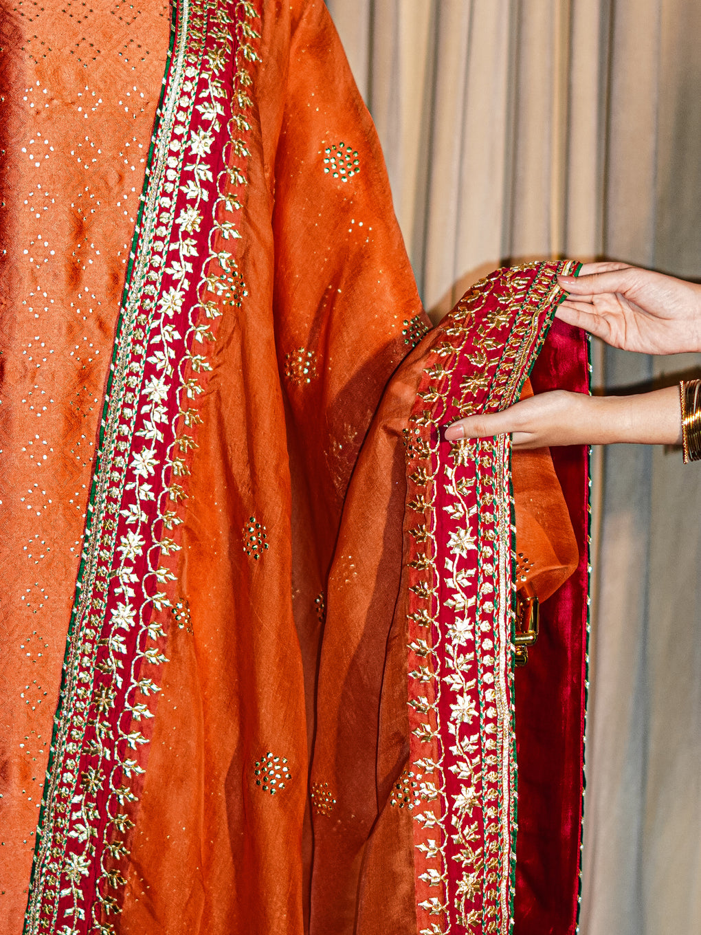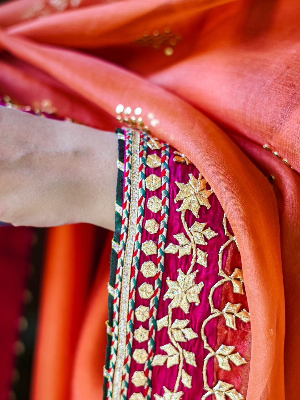 An Exquisite Ensemble Featuring A Katan Organza Dupatta Adorned With Gota And Mukesh Work. The Self Tissue Silk Shirt Pairs Beautifully With A Matching Silk Tissue Trouser. Hand Twisted Detailing Adds A Touch Of Traditional Finesse. Designed In A Zero Size Tailored Fit, Perfect For Festive And Formal Occasions.