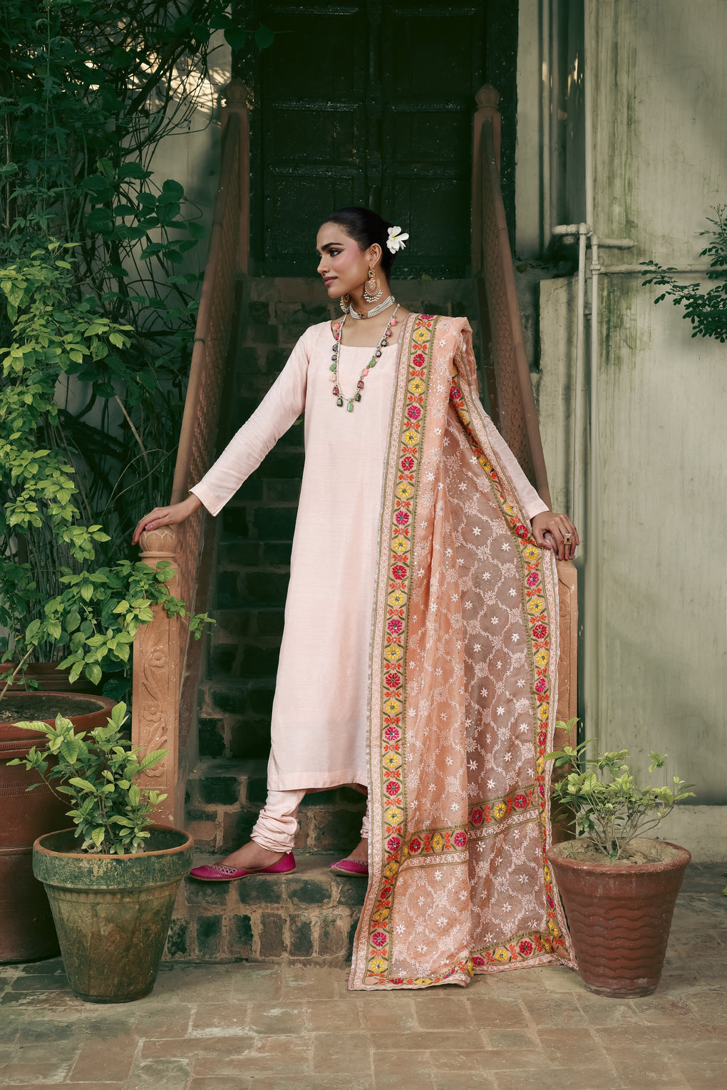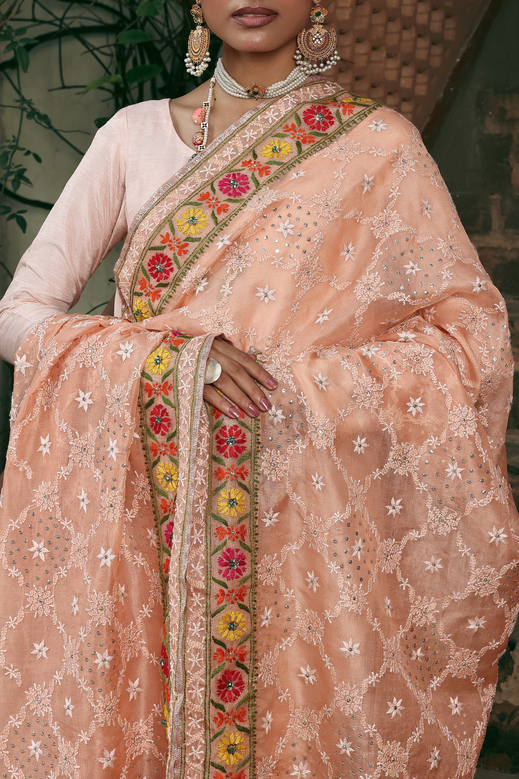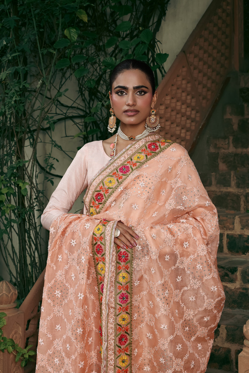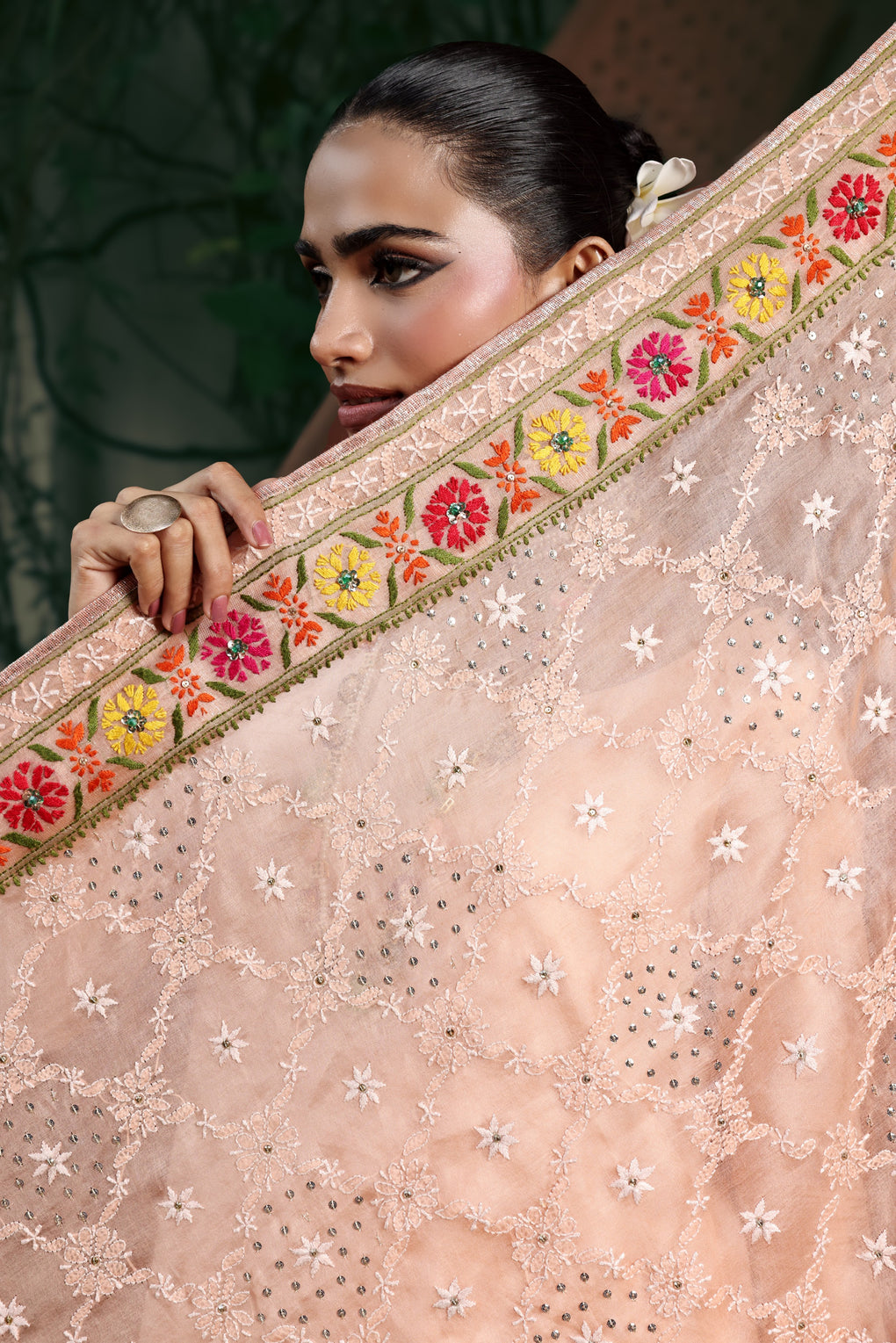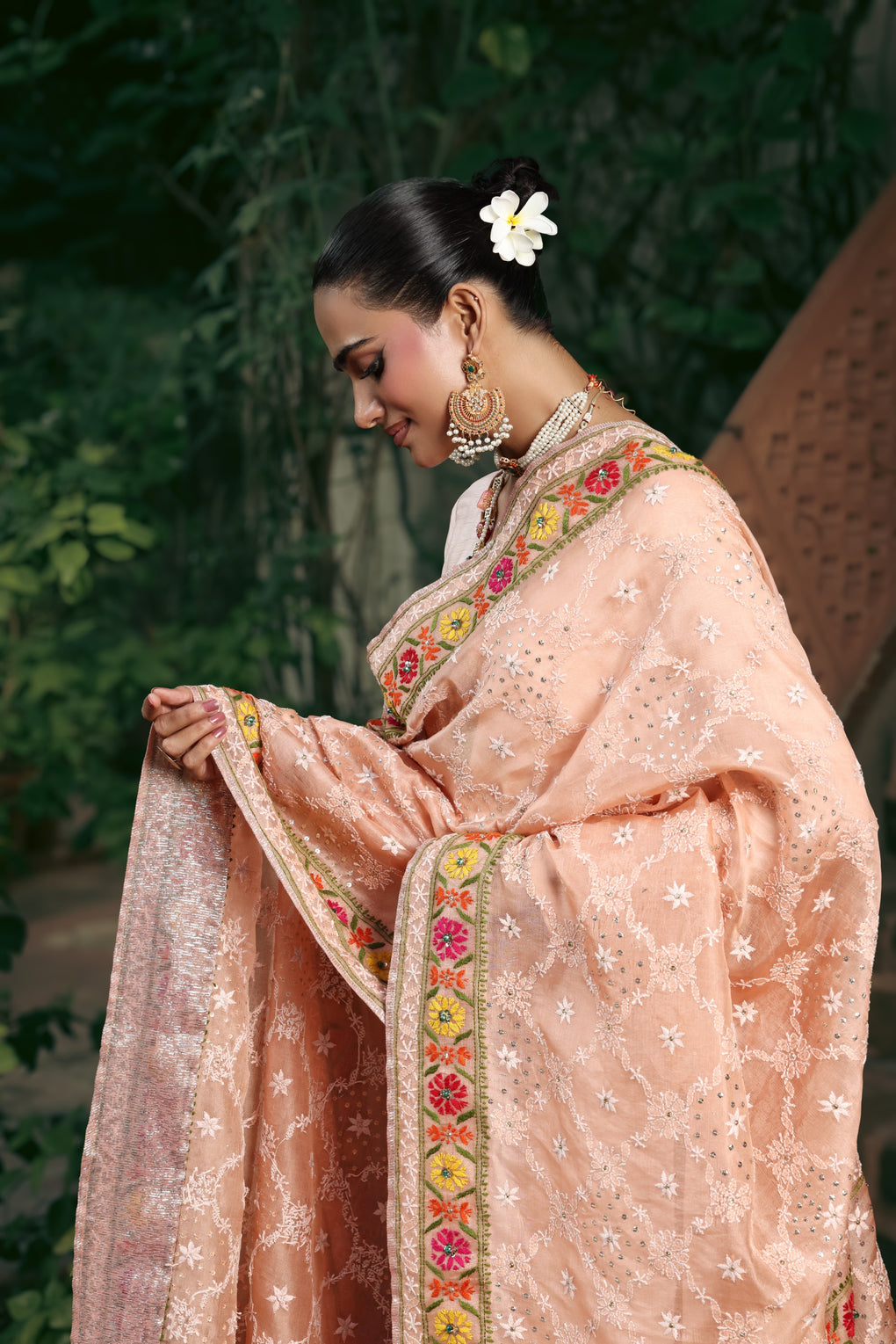 Chikankari embellished with peachy gold sequins finished with lama chiffon.
