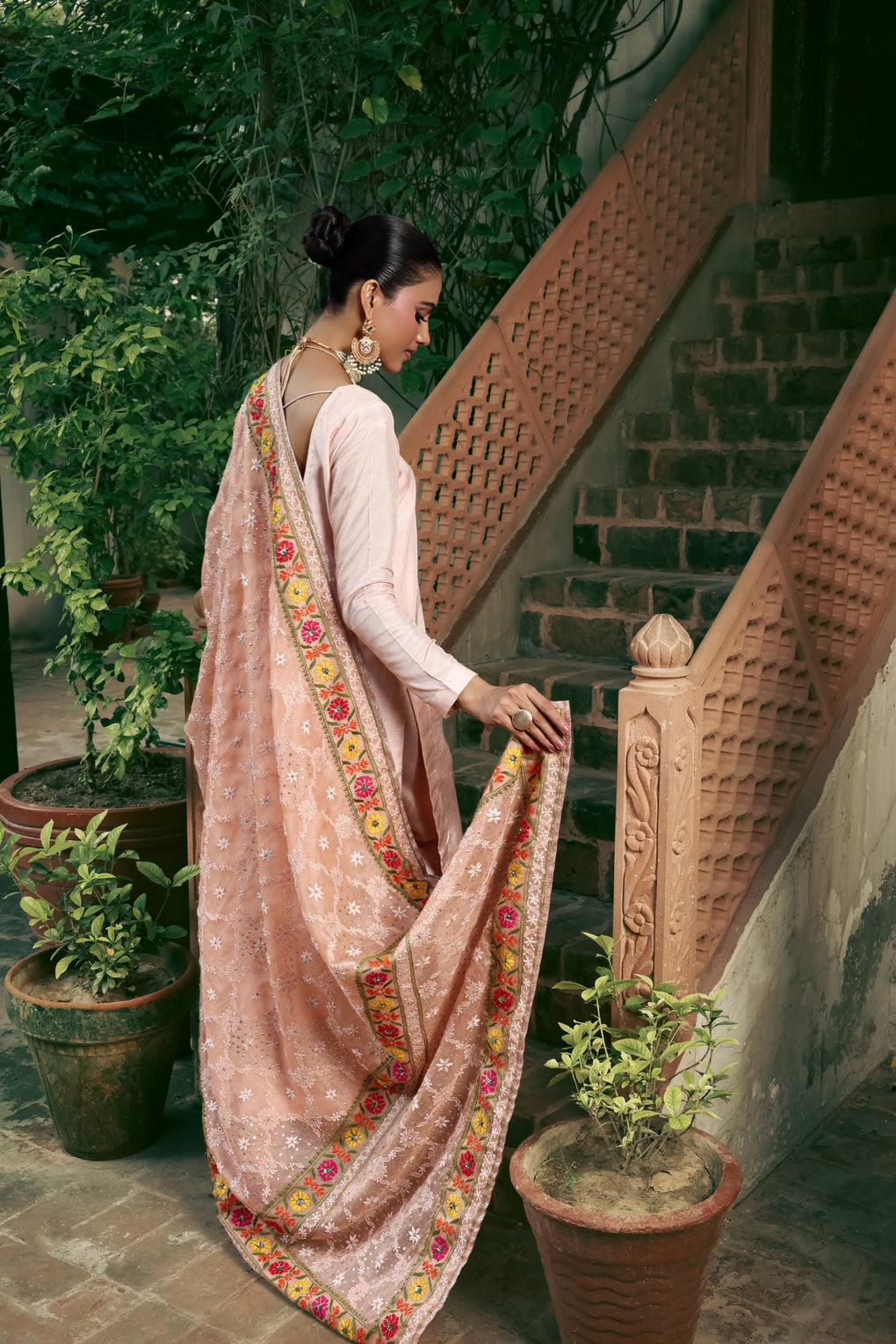 DUR-E-NAYAB — A 3-yard dupatta in salmon , crafted from katan organza . Adorned with chikankari embellished with peachy gold sequins finished with lama chiffon. Priced at 75K PKR.