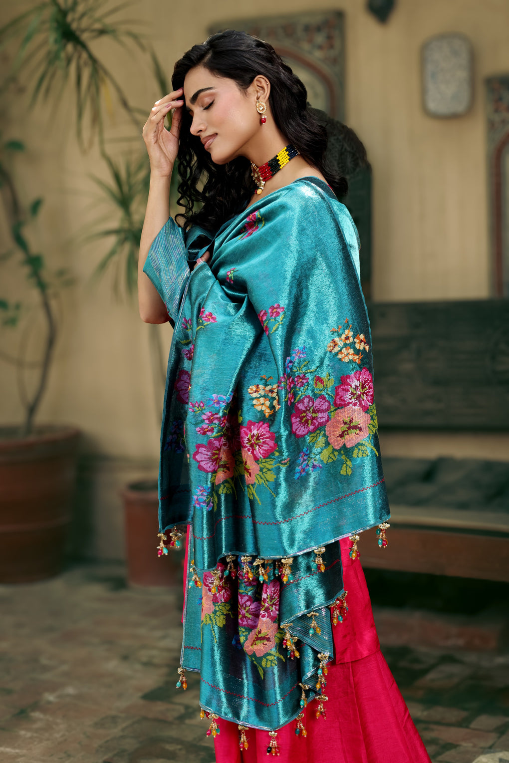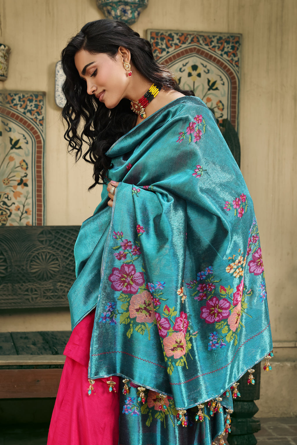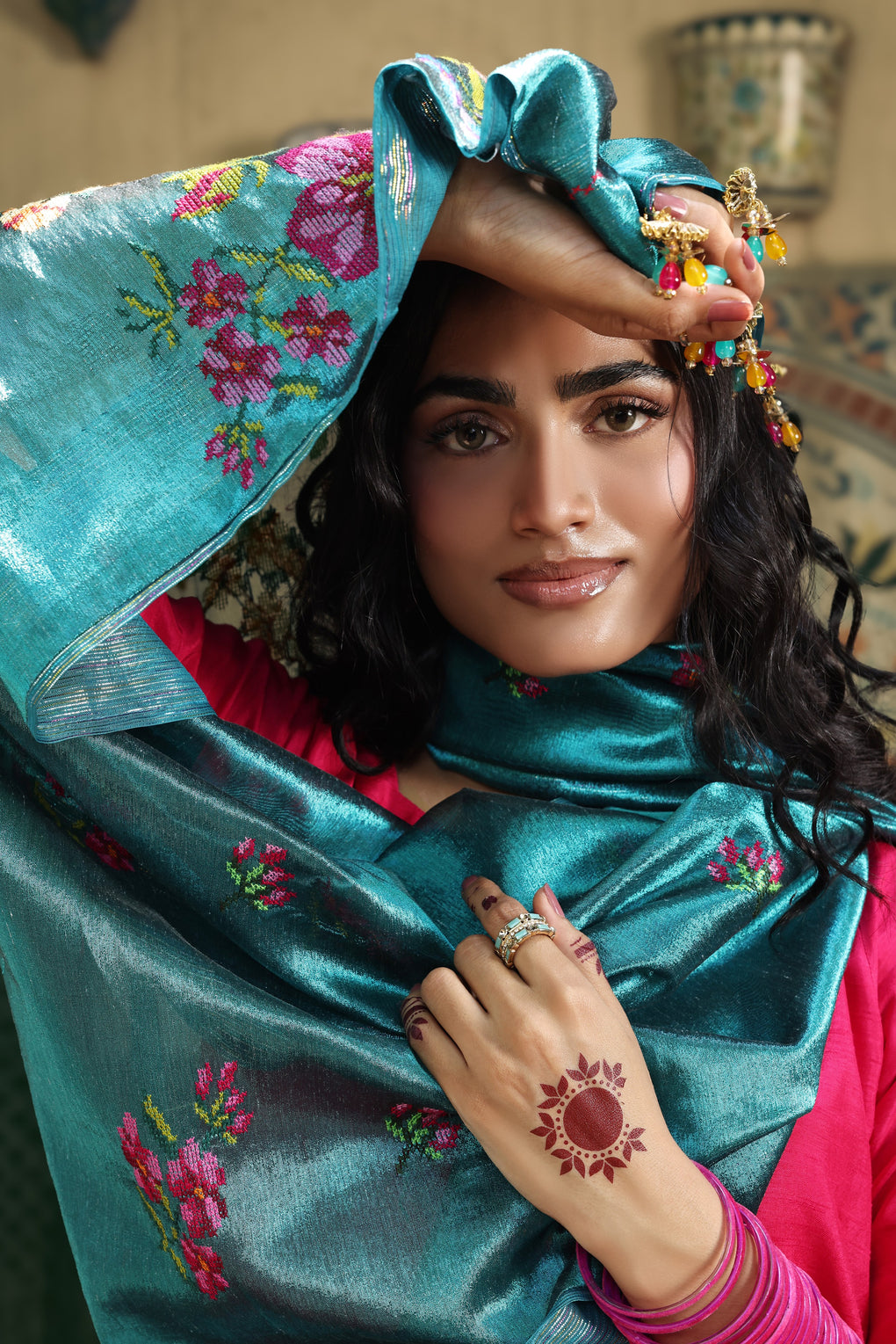 GULNAAZ — A 3-yard dupatta in turqouis , crafted from pure tissue. Adorned with cross stitch finished with stoneand gota tassels , this product shows enduring style.