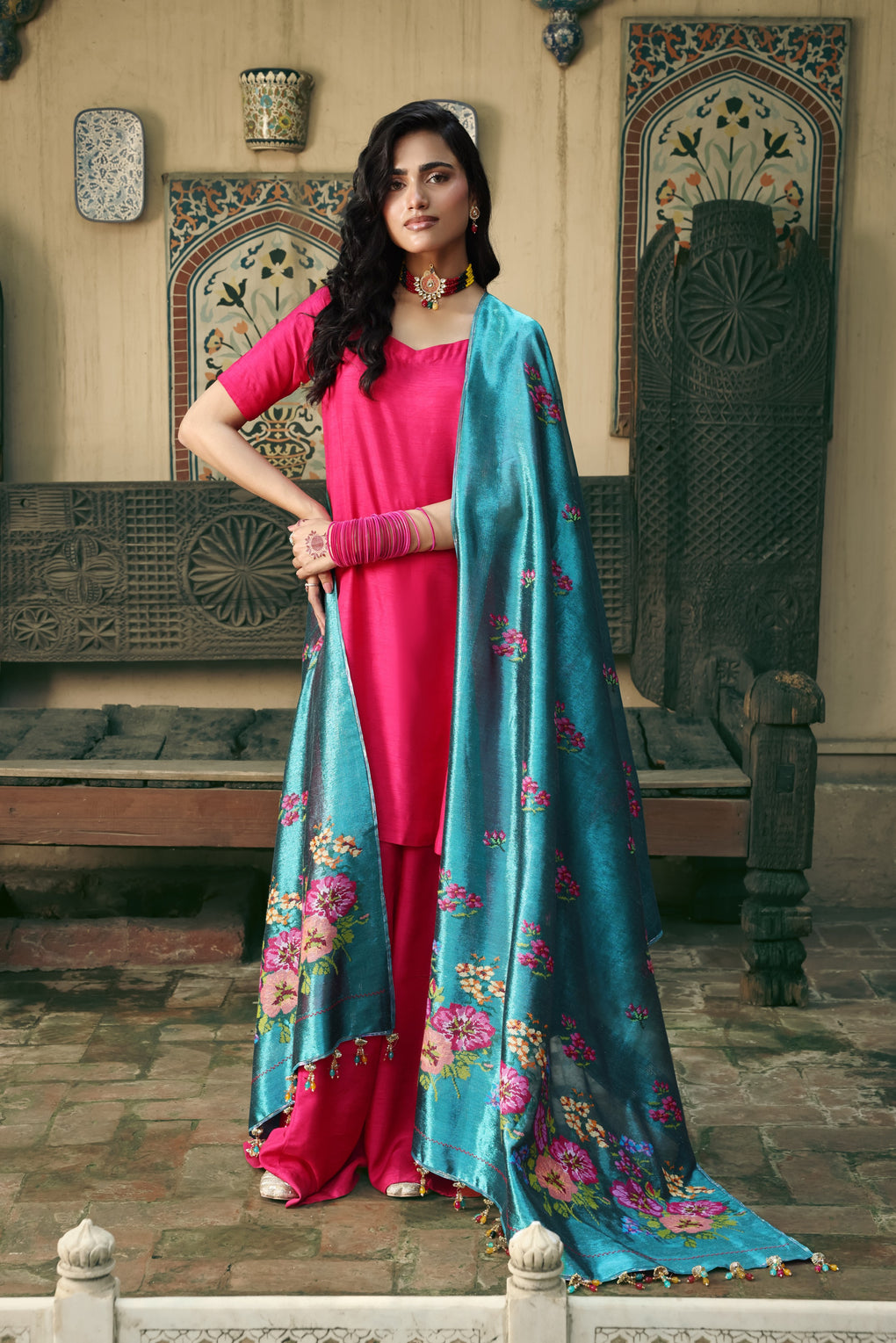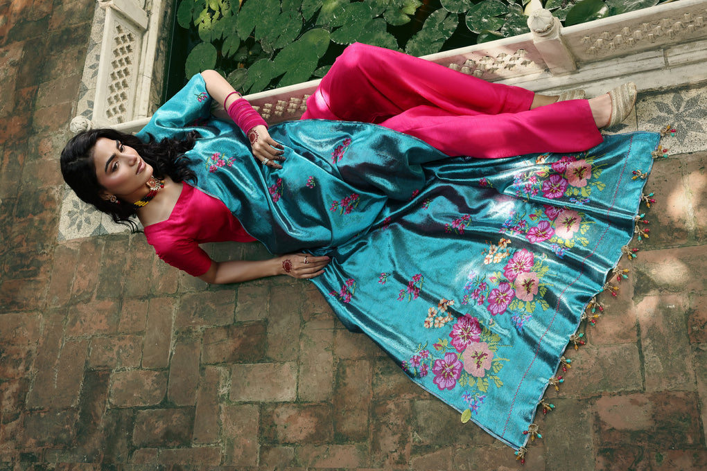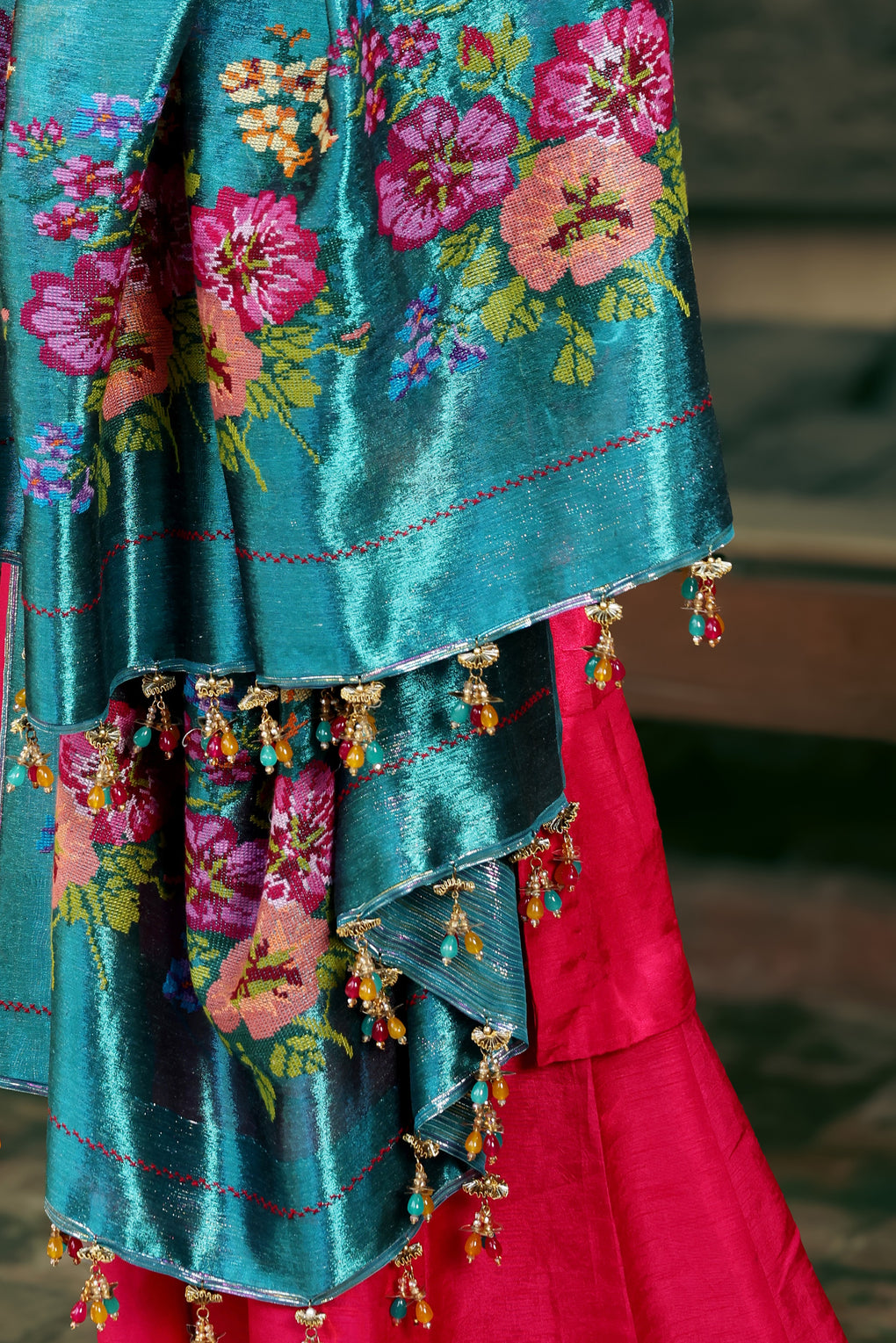 GULNAAZ — A 3-yard dupatta in turqouis , crafted from pure tissue. Adorned with cross stitch finished with stoneand gota tassels , this product shows enduring style.