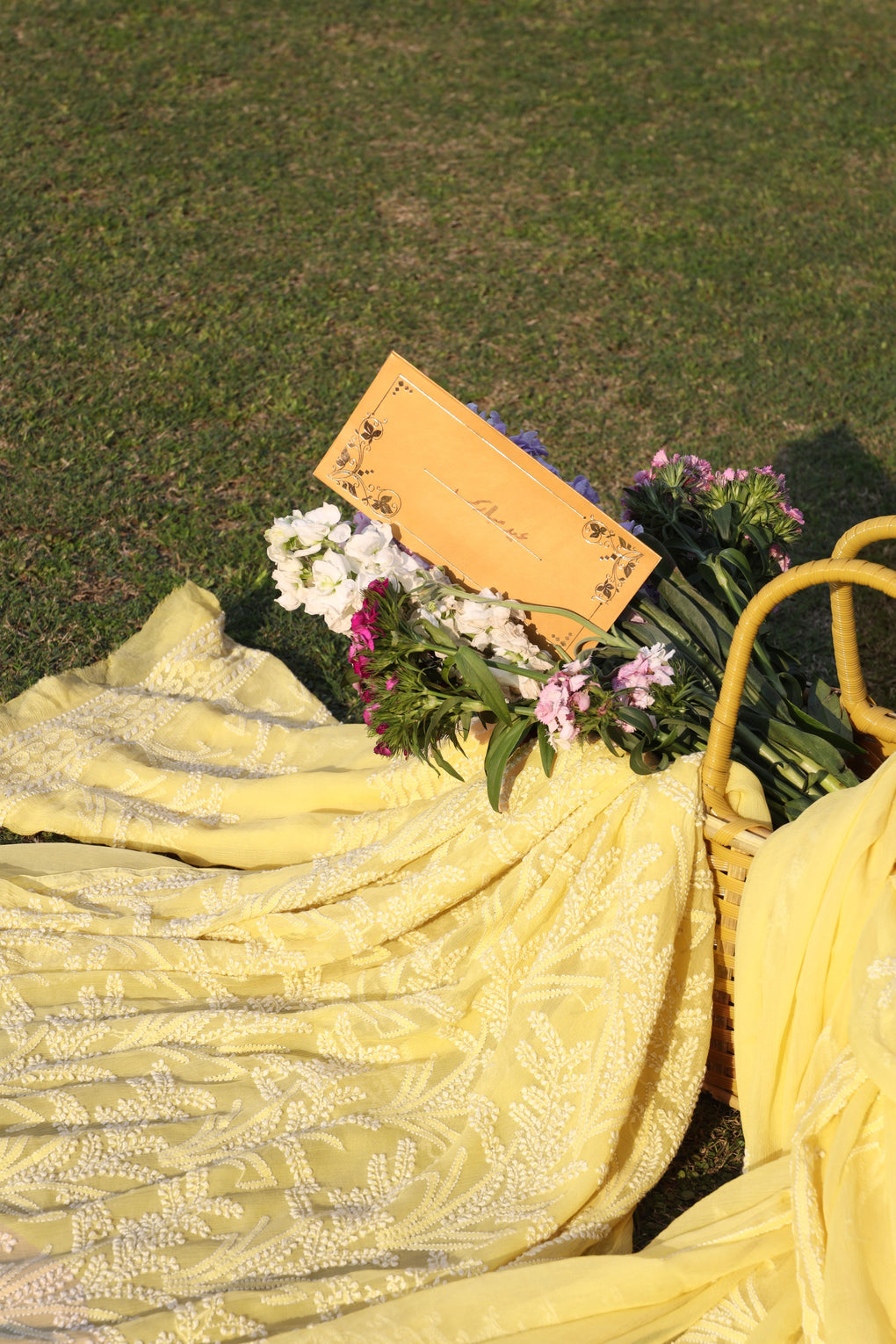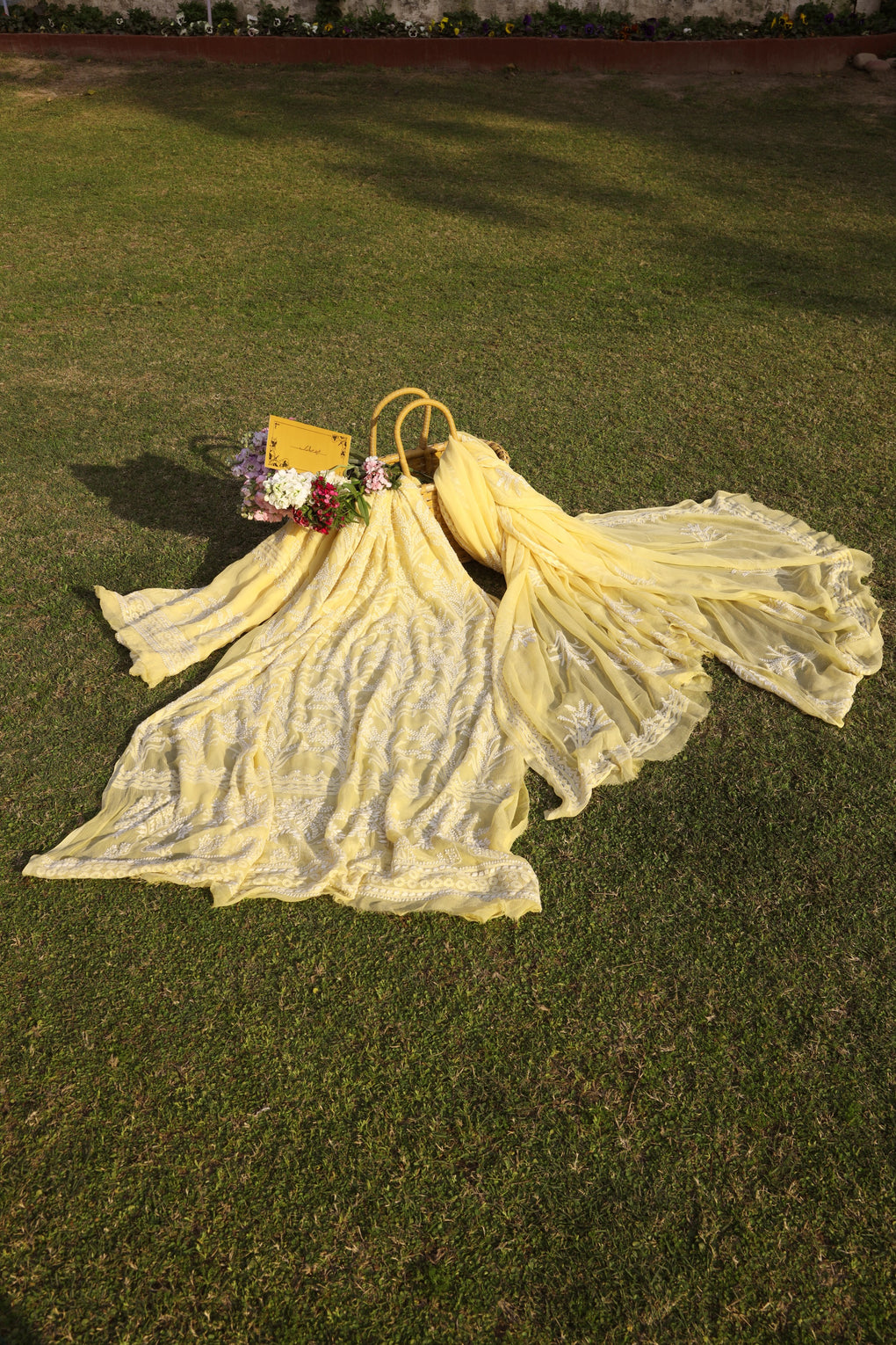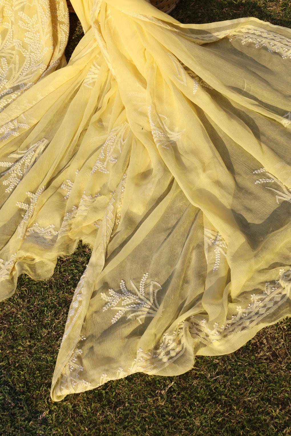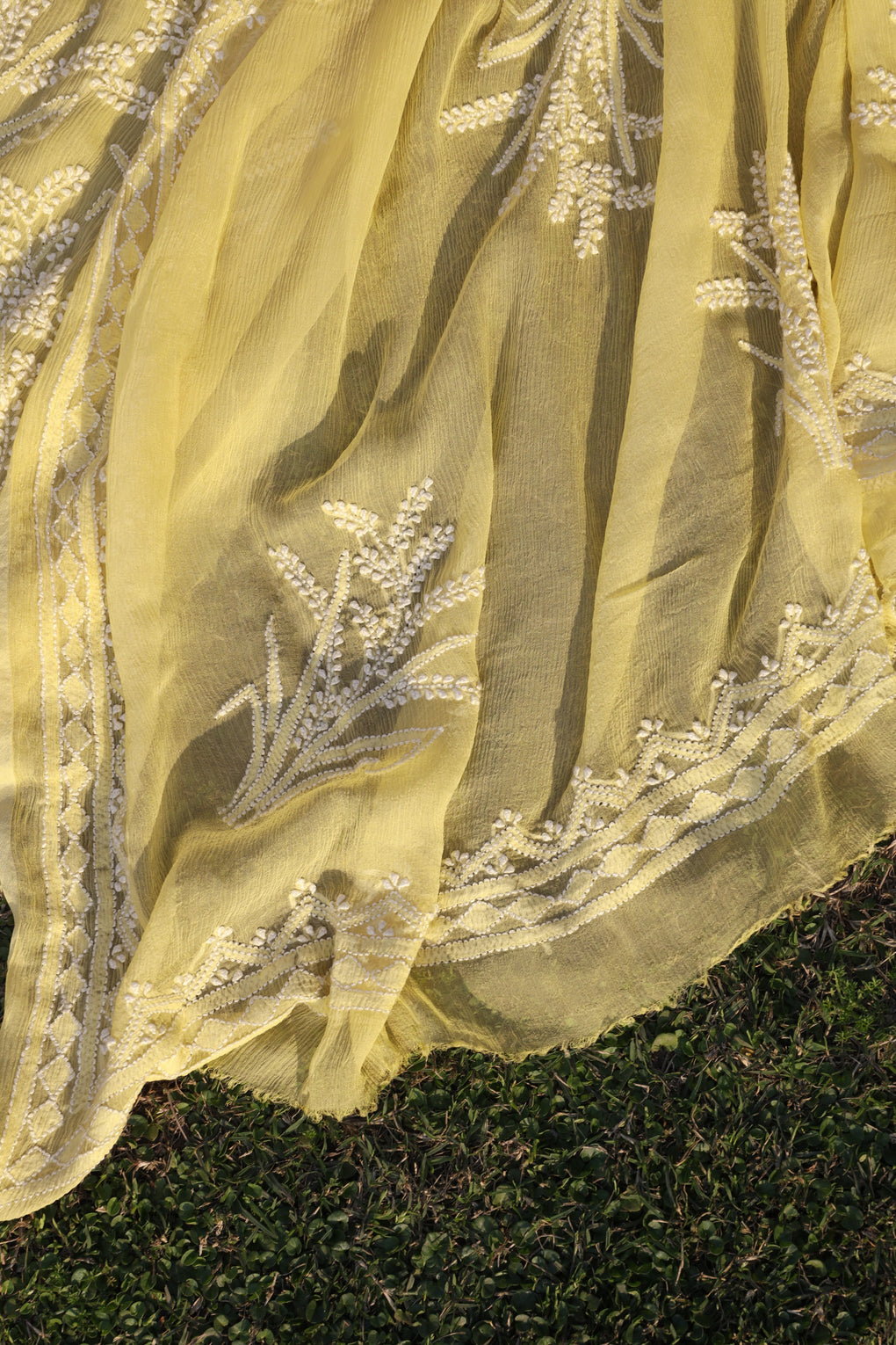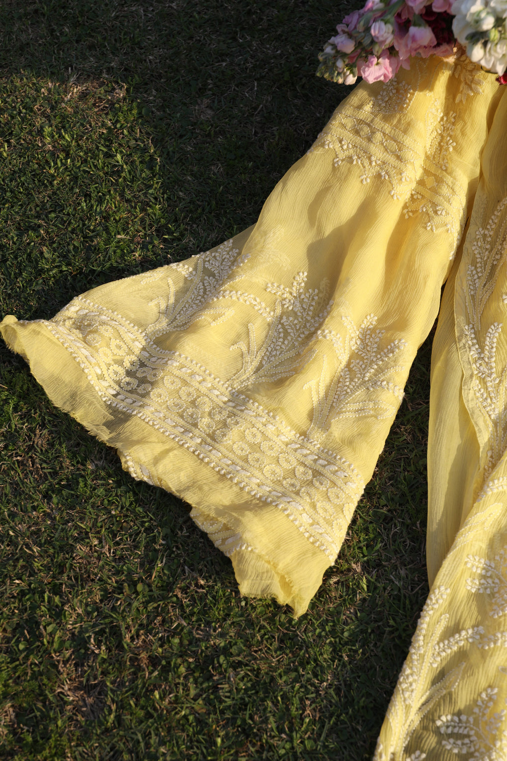 A breezy butter-yellow ensemble in pure crinkle chiffon, featuring delicate chikankari work that exudes femininity and summer charm. Lightweight, graceful, and effortlessly refined.