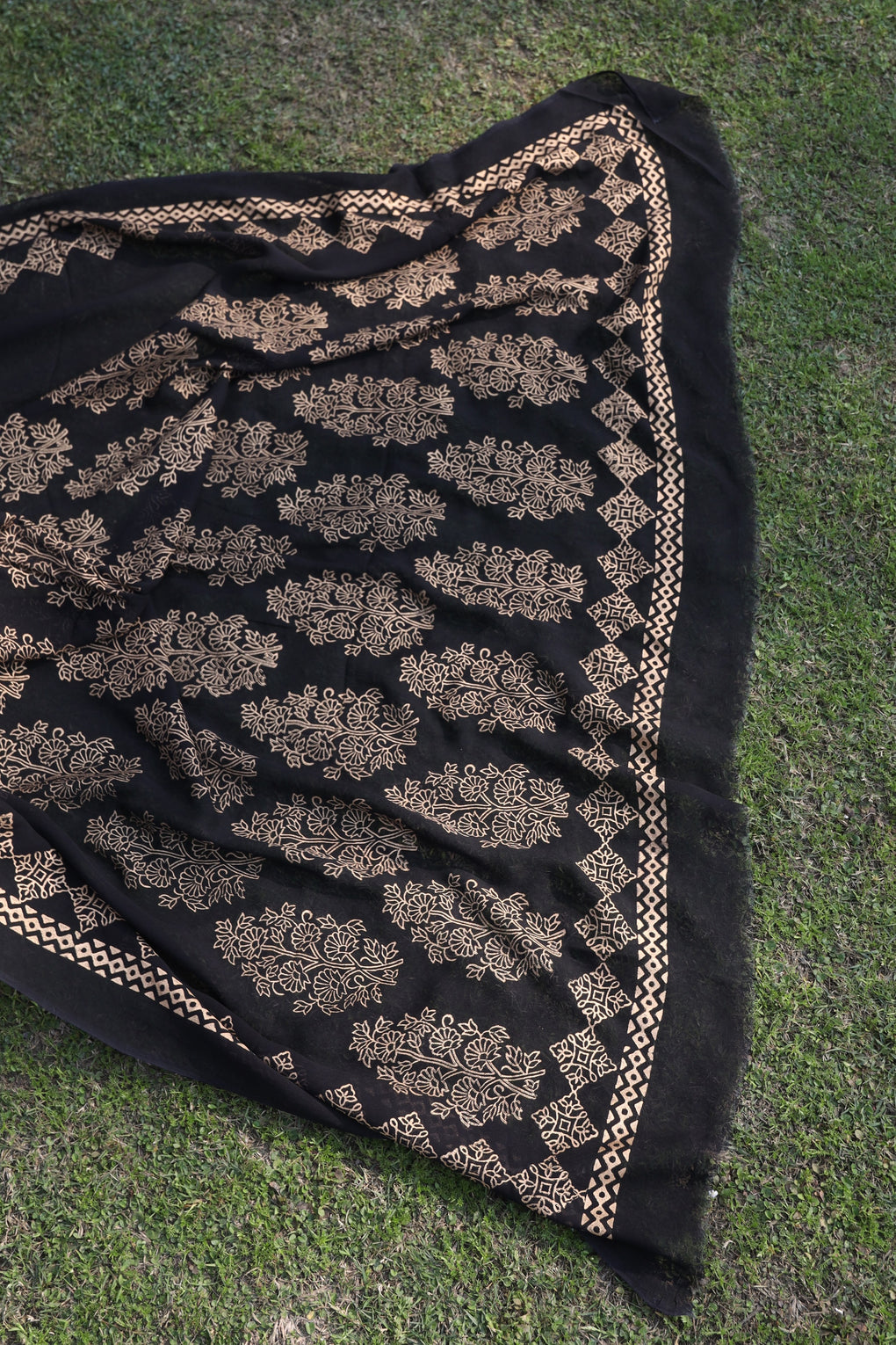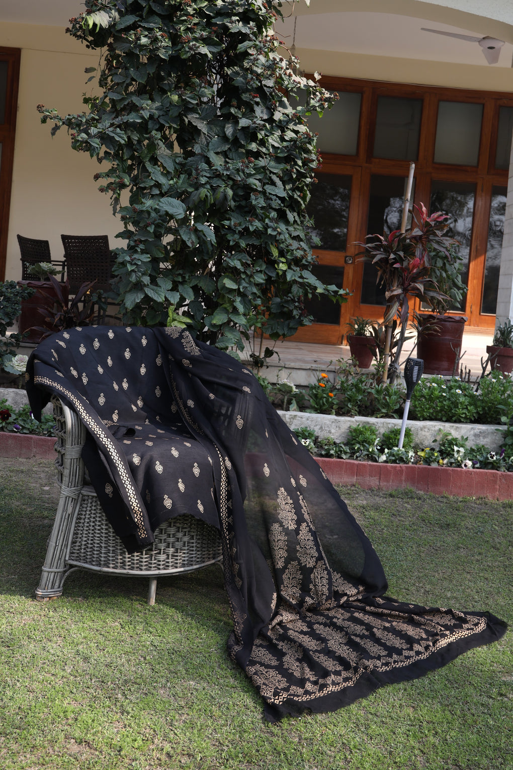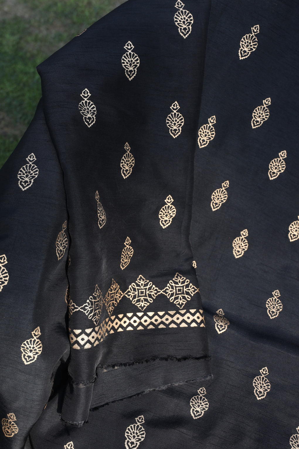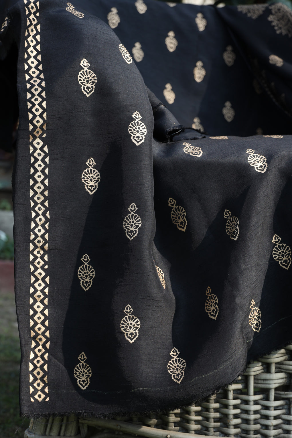 Tabassum blends the richness of Korean raw silk with the fluid elegance of chiffon georgette. Enhanced with antique gold block printing, this ensemble is a timeless black formal with a regal finish.